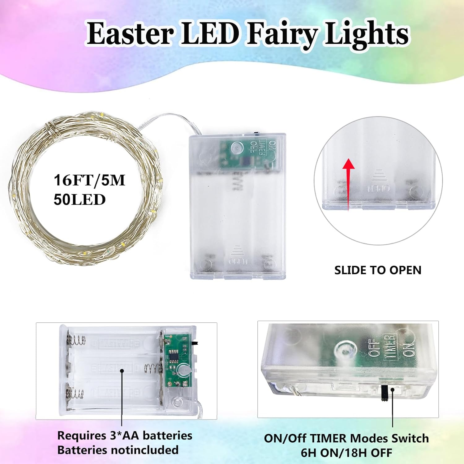- Spring Easter Decoration Lights: These 16ft 50 LED Easter fairy lights are powered by 3 AA batteries (not included) and remain cool to the touch even after extended use, ensuring complete safety. With their soft and enchanting glow, they make a perfect decoration for your Easter Day celebrations
