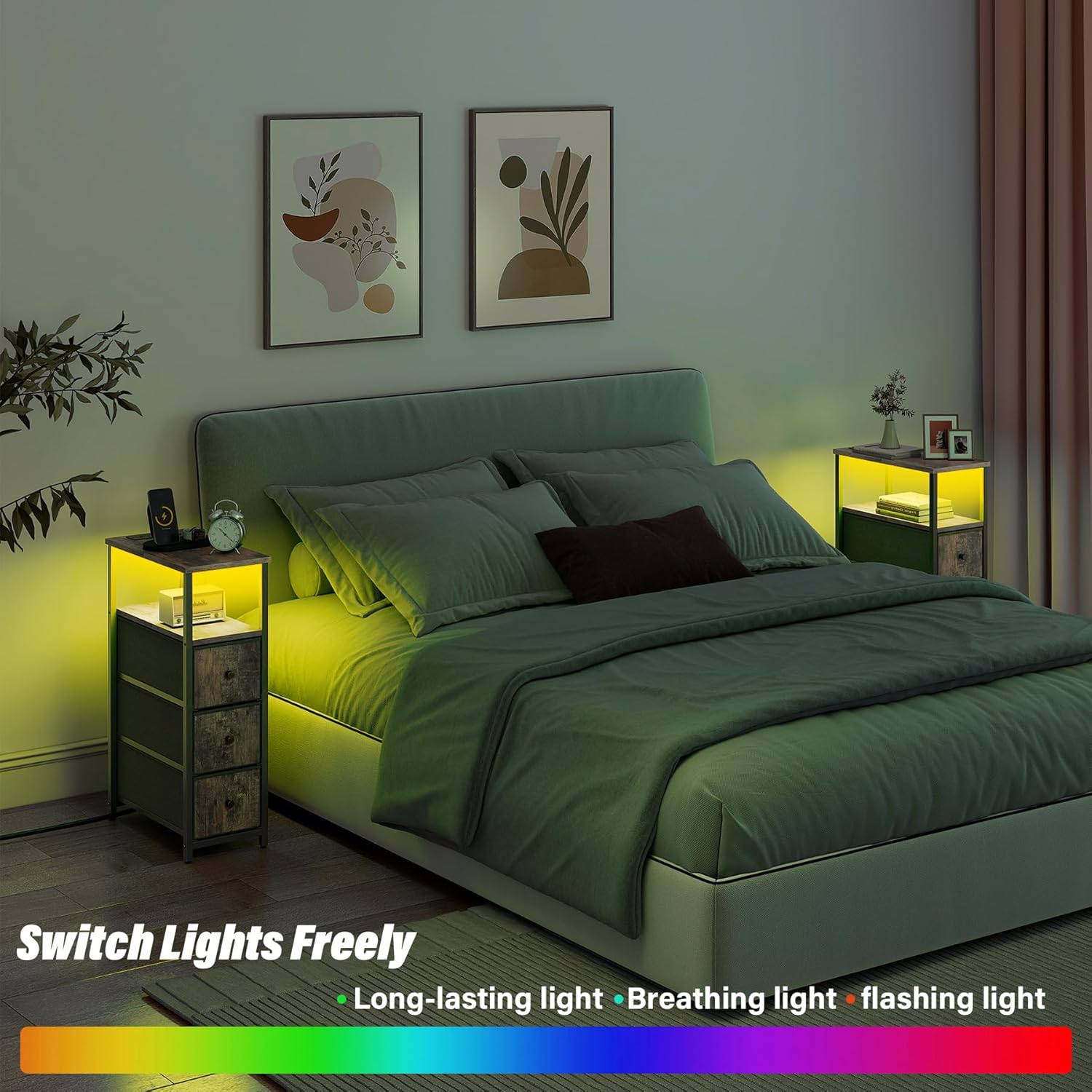 TUTOTAK Narrow LED Night Stand with Charging Station, Slim End Table with Plugins, Tall Side Table with 3 Fabric Drawer, Small Bedside Table with Storage, Set of 2, for Living Room, Brown TB01BB073L