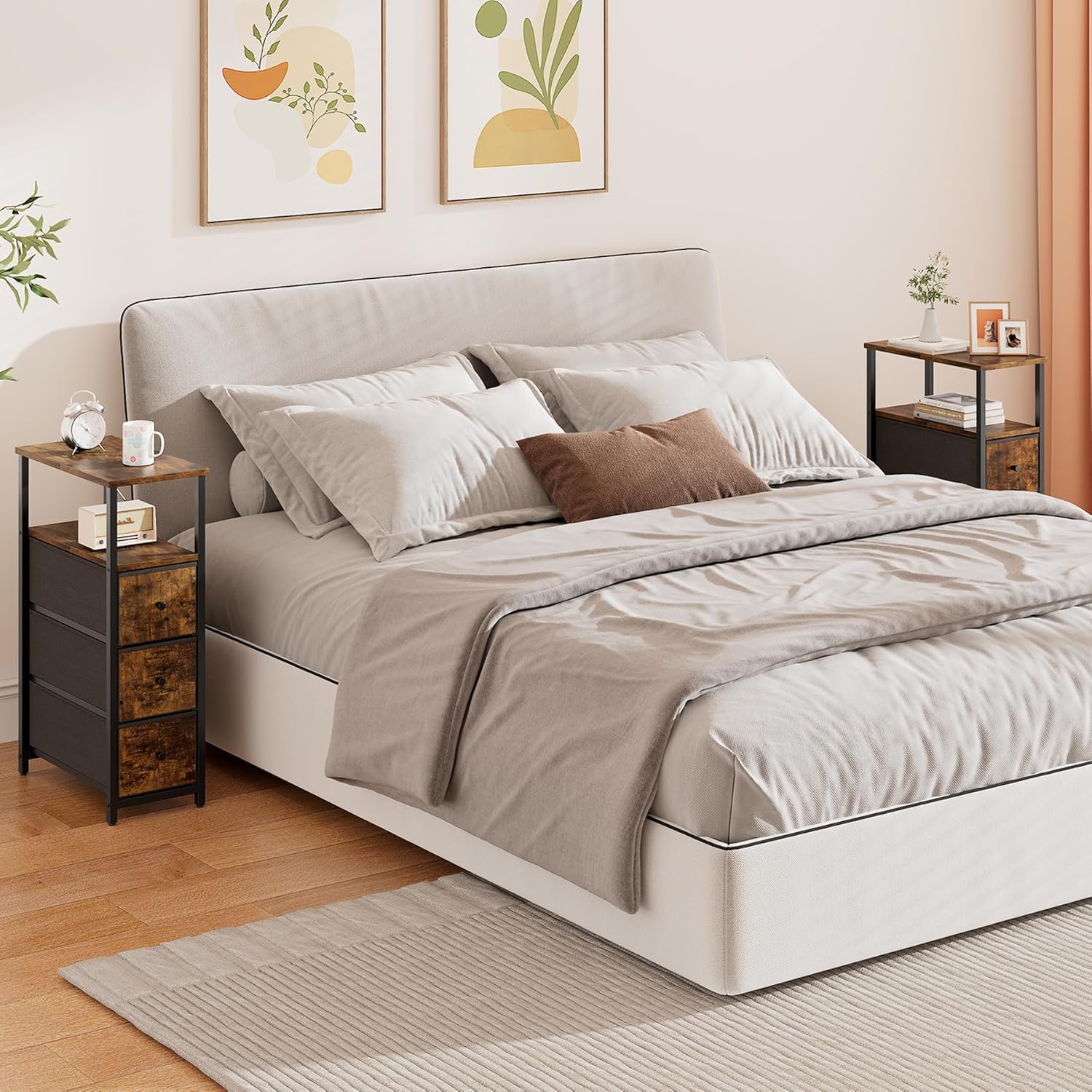 TUTOTAK Narrow Night Stand, Slim End Table, Tall Side Table with 3 Fabric Drawer, Small Bedside Table with Storage, Set of 2, for Living Room, Bedroom, Brown TB01BB072