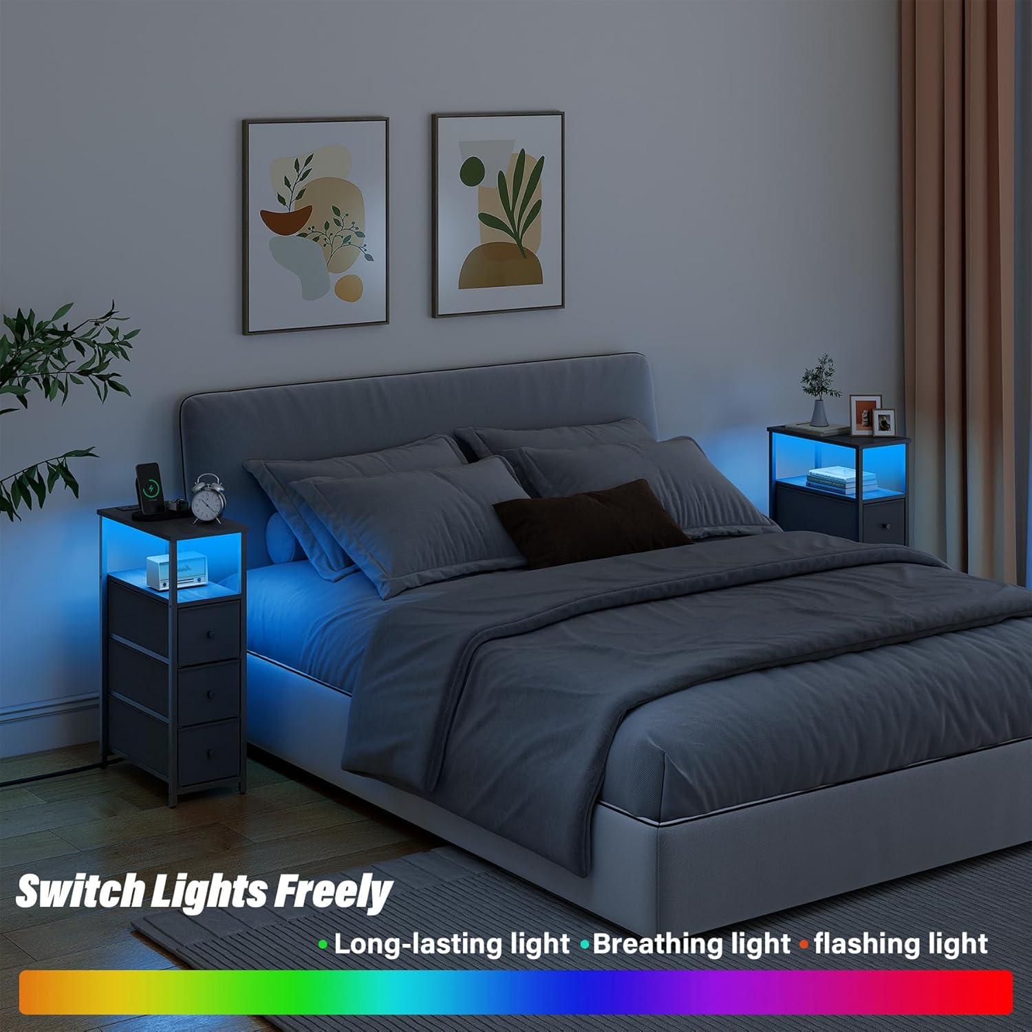TUTOTAK Narrow LED Night Stand with Charging Station, Slim End Table with Plugins, Tall Side Table with 3 Fabric Drawer, Small Bedside Table with Storage, Set of 2, for Living Room, Black TB01BK073L