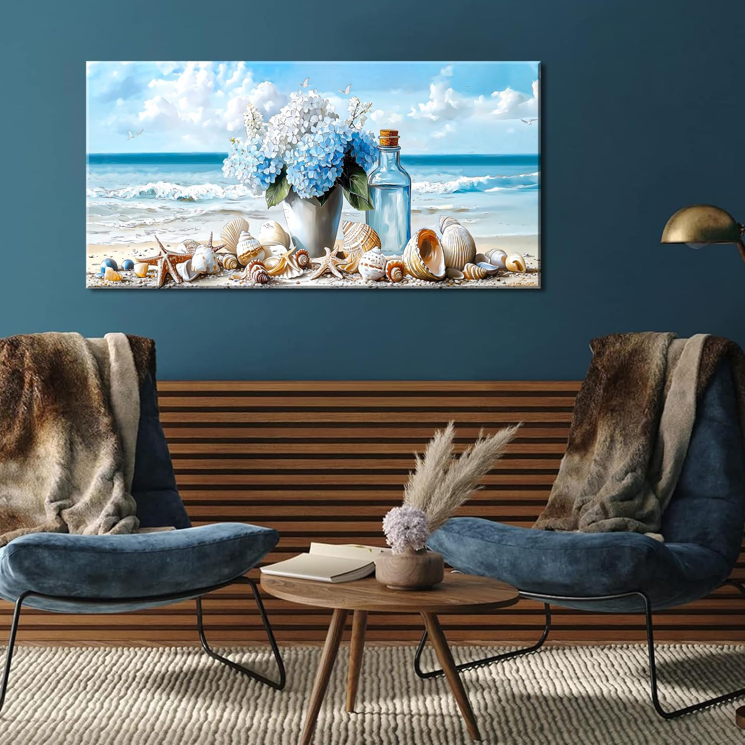 LASMOND Romantic Beach Wall Art for Living Room Blue Shells Conch Vase Canvas Prints Modern Large Flower Bottle Bedroom Ocean Artwork Decor (40x20 Inches)