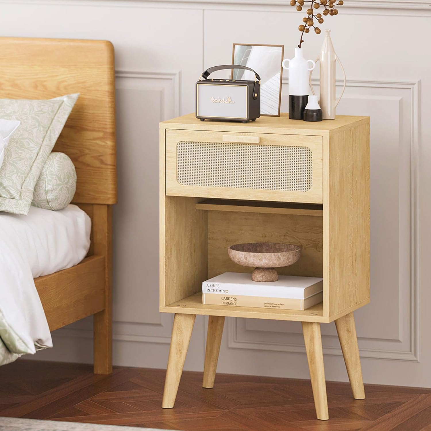 Rattan Nightstand with Opening Storage,Boho Bedside Table with Drawer,Wood Nightstand with Solid Wood Legs,End Side Table for Living Room,Bedroom,Small Space Natural CTG62Y