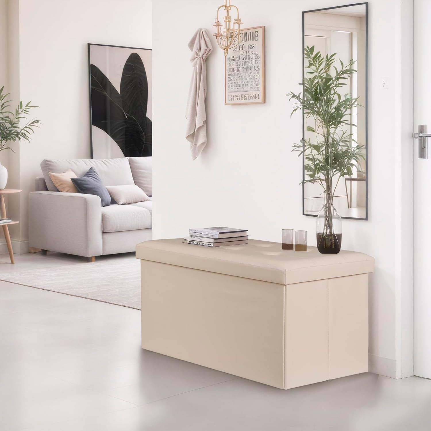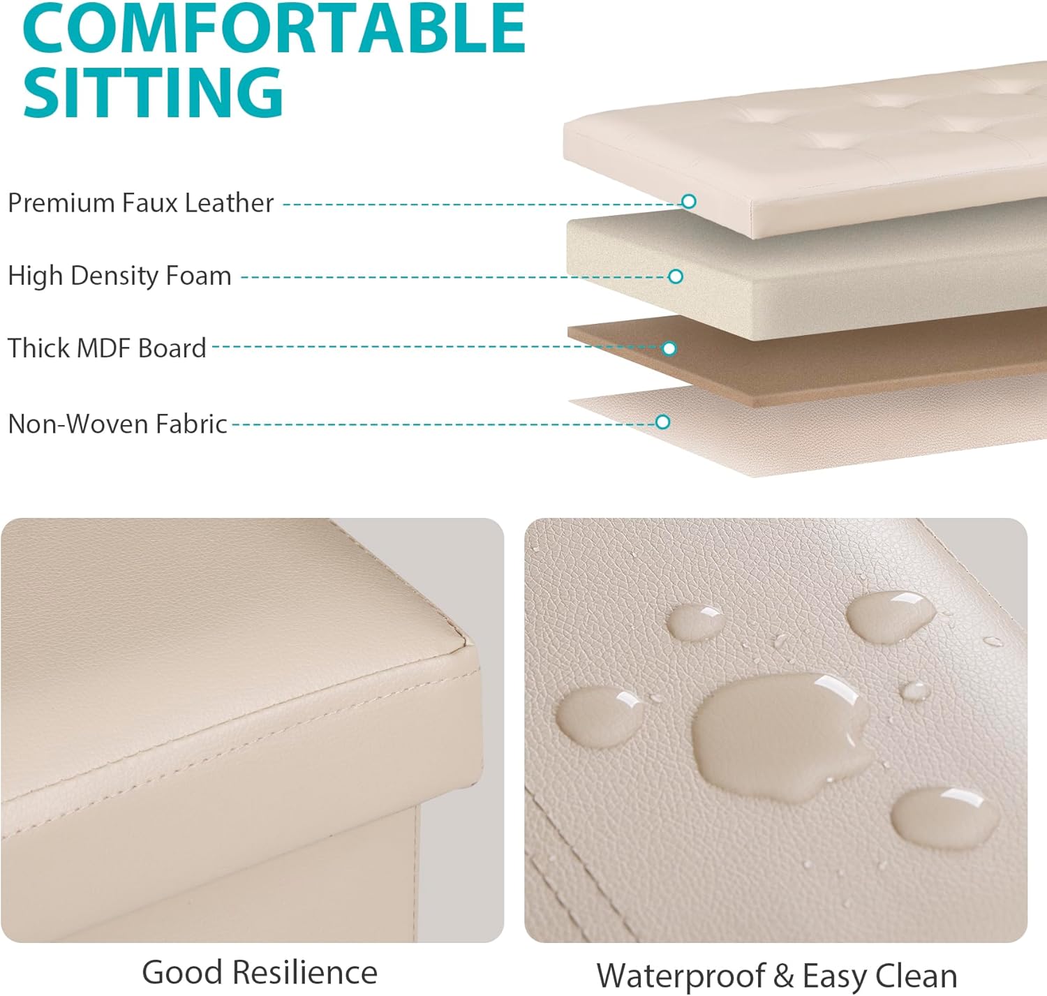 SUPER DEAL Folding Storage Ottoman Bench, 30 Inches Footrest Storage Bin with Padded Seat, Entryway Shoe Bench for Living Room Bedroom, 30"x15"x15", Faux Leather, Beige