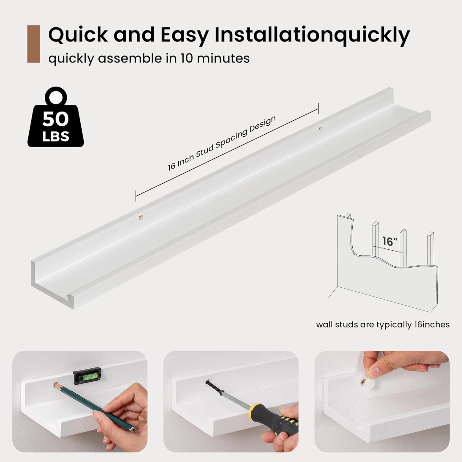 - 3.5" Floating Picture Ledge: Anti-Slip Narrow Design-3.5" ultra-narrow depth holds frames/plants without sliding, even on angled walls. Stud-Mounted Stability-16" pre-drilled holes match standard studs (hardware incl.) for wobble-free install. Clutter-Free Aesthetic-Clean lines blend with farmhouse/Scandinavian decor, focusing on your treasures