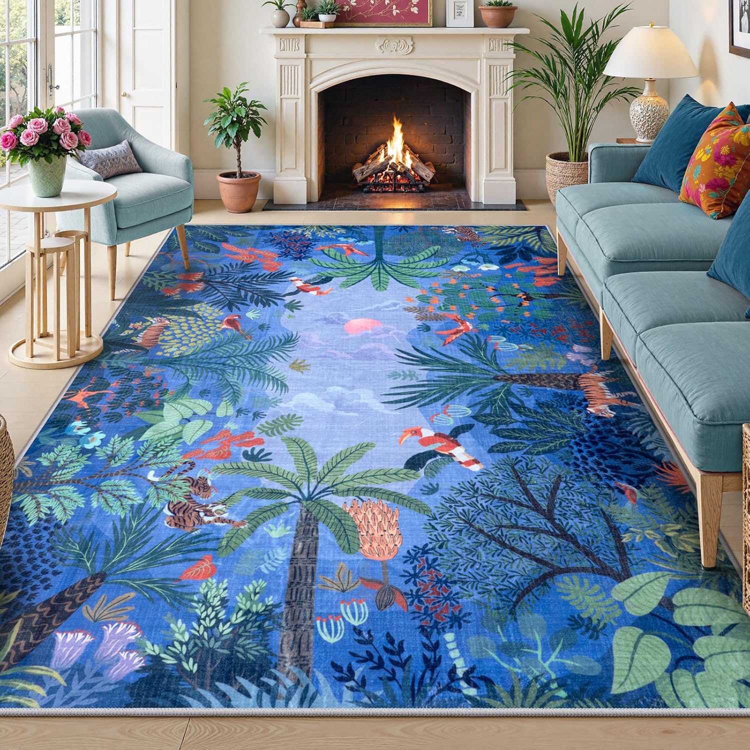 LIVEBOX Washable Jungle Animal Print Rugs 9x12 Blue Rugs for Living Room, Stain Resistant Soft Kids Area Rugs for Bedroom, Non-Skid Modern Dining Room Rug Floor Carpet for Playroom Kids Nursery