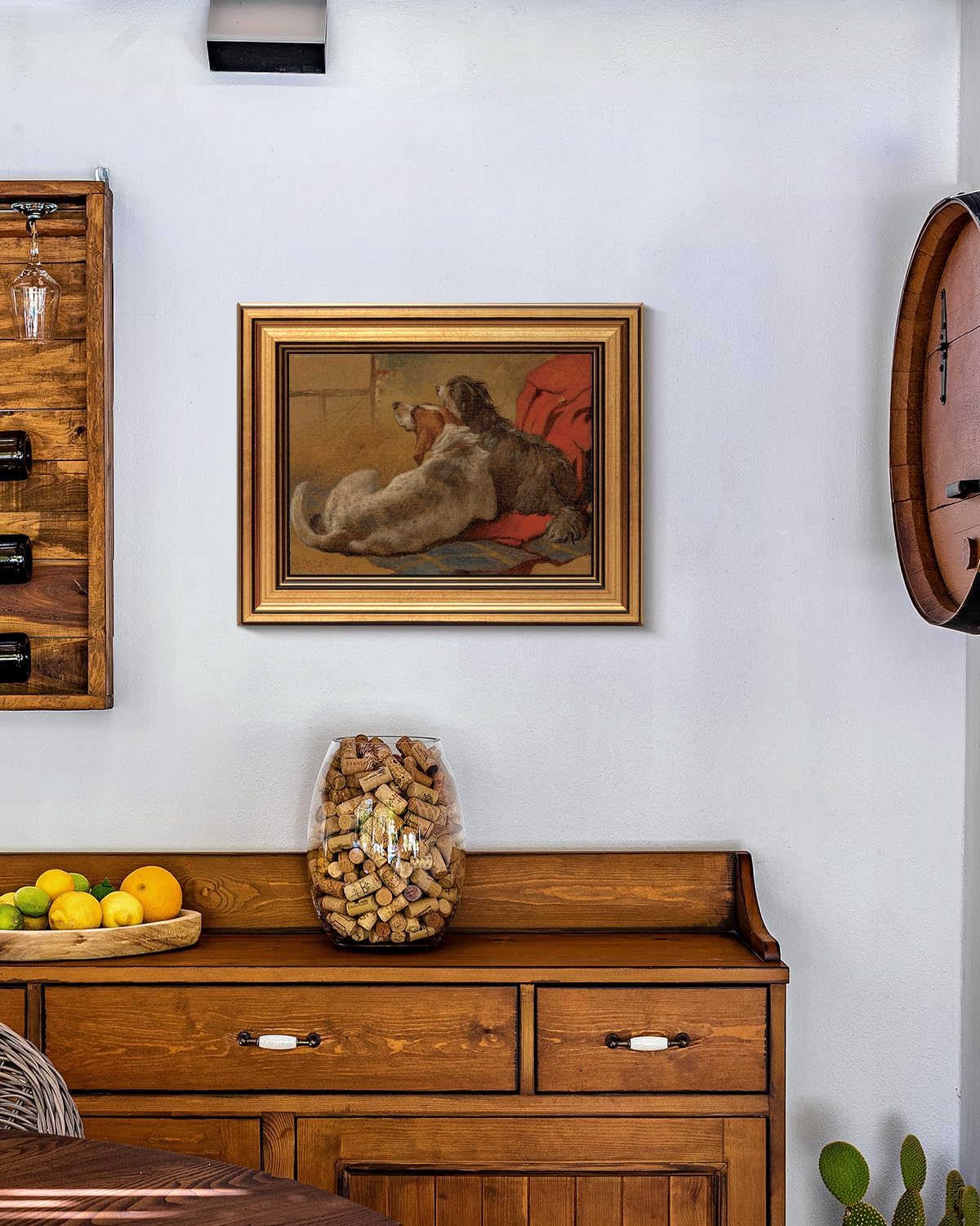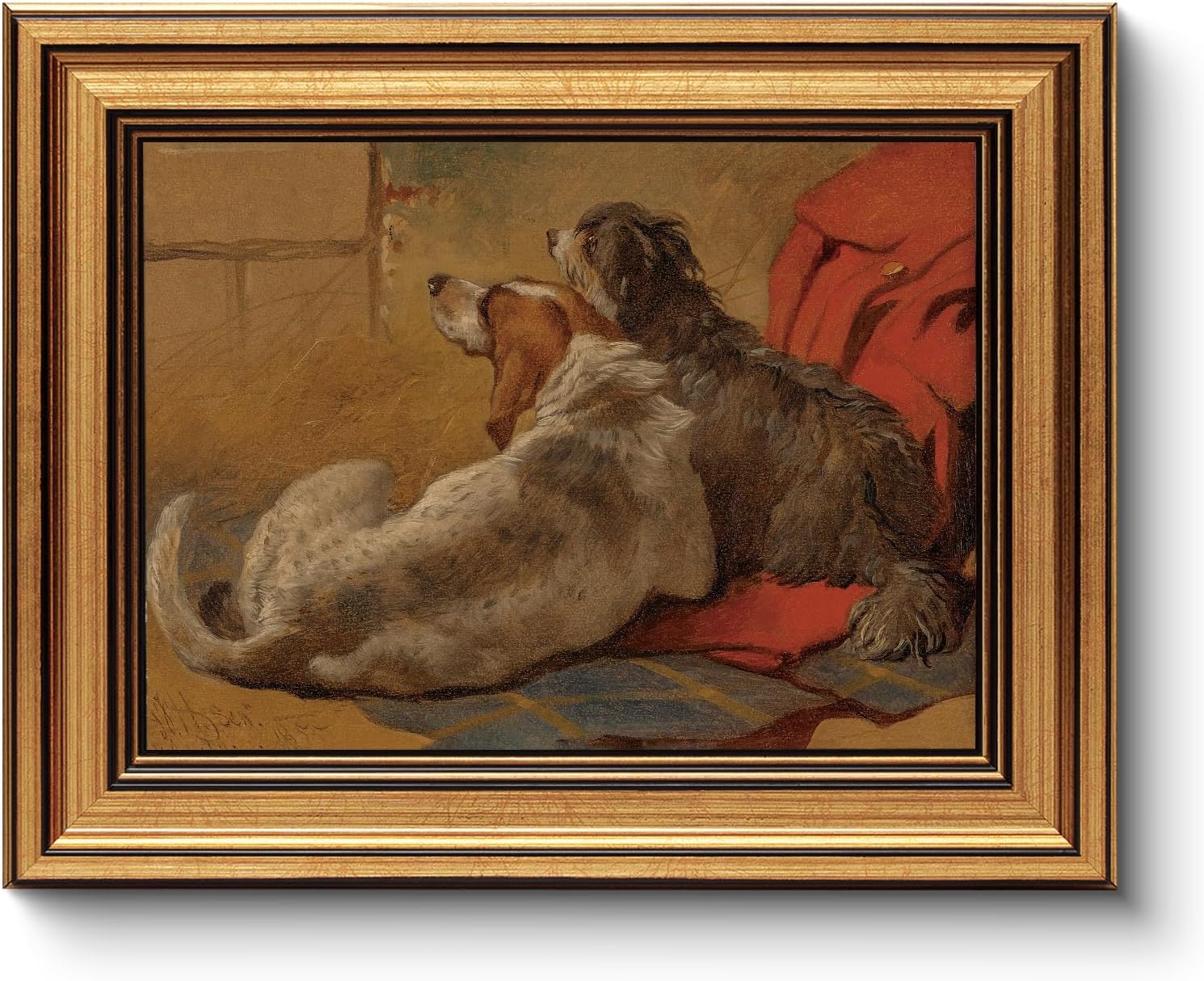 - HEARTWARMING DOG PRINTS ROOM AESTHETIC: This oil painting wall art decor, rendered in a warm vintage style, captures a serene moment of two dogs resting closely together, evoking feelings of loyalty, companionship, and the warmth of home. The artwork painting prints features a soft, muted color palette. The texture of the fur is meticulously detailed through delicate brushstrokes, while the touch of red fabric adds a dynamic contrast to the composition