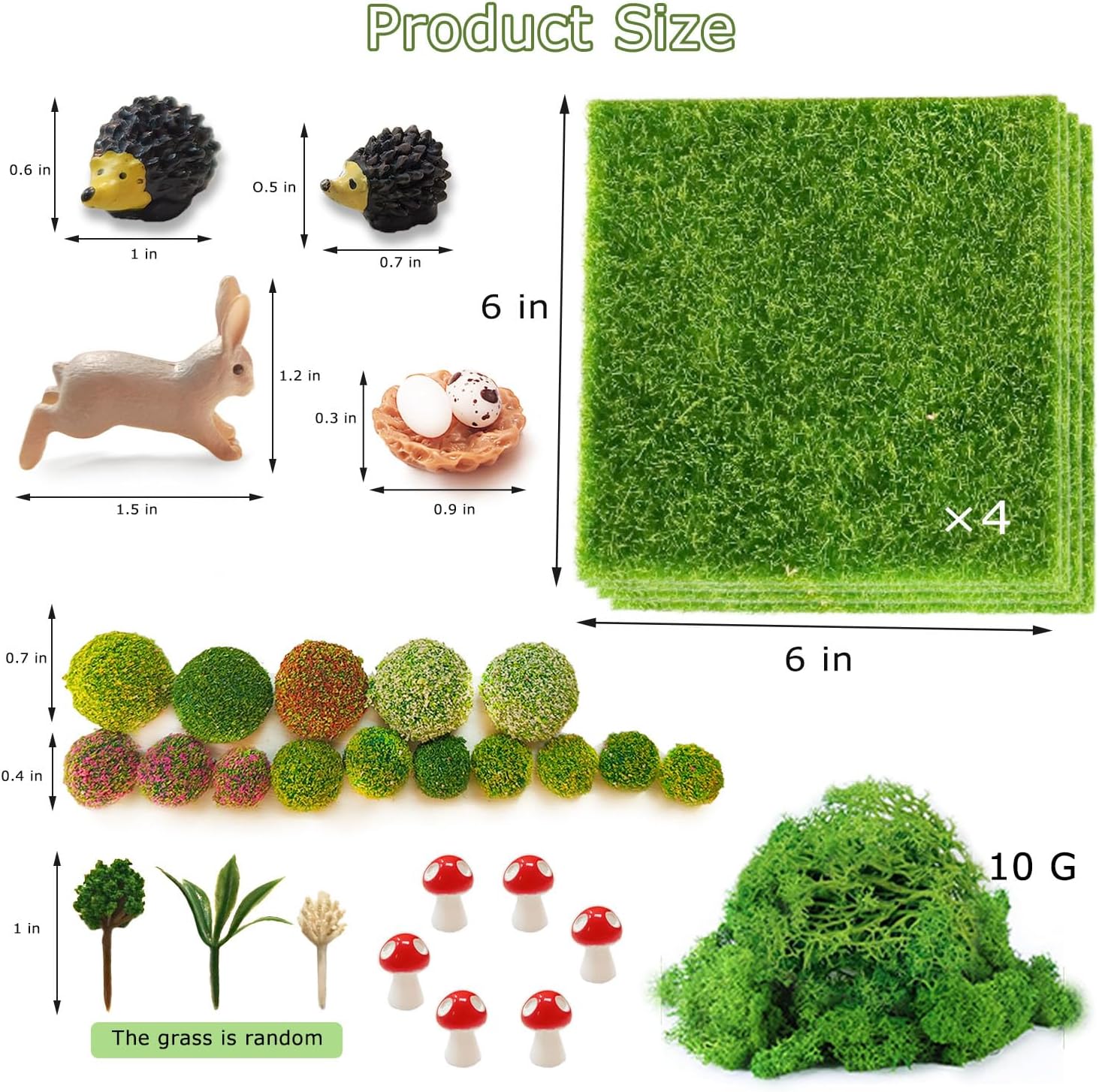 - Content:You can receive a total of 36 pieces from this mini garden grass set, containing 4 pieces of artificial dollhouse fairy garden grass, a pack of grass balls, fake moss, miniature garden figurines with hedgehogs, rabbits, and small mushrooms,tree and more