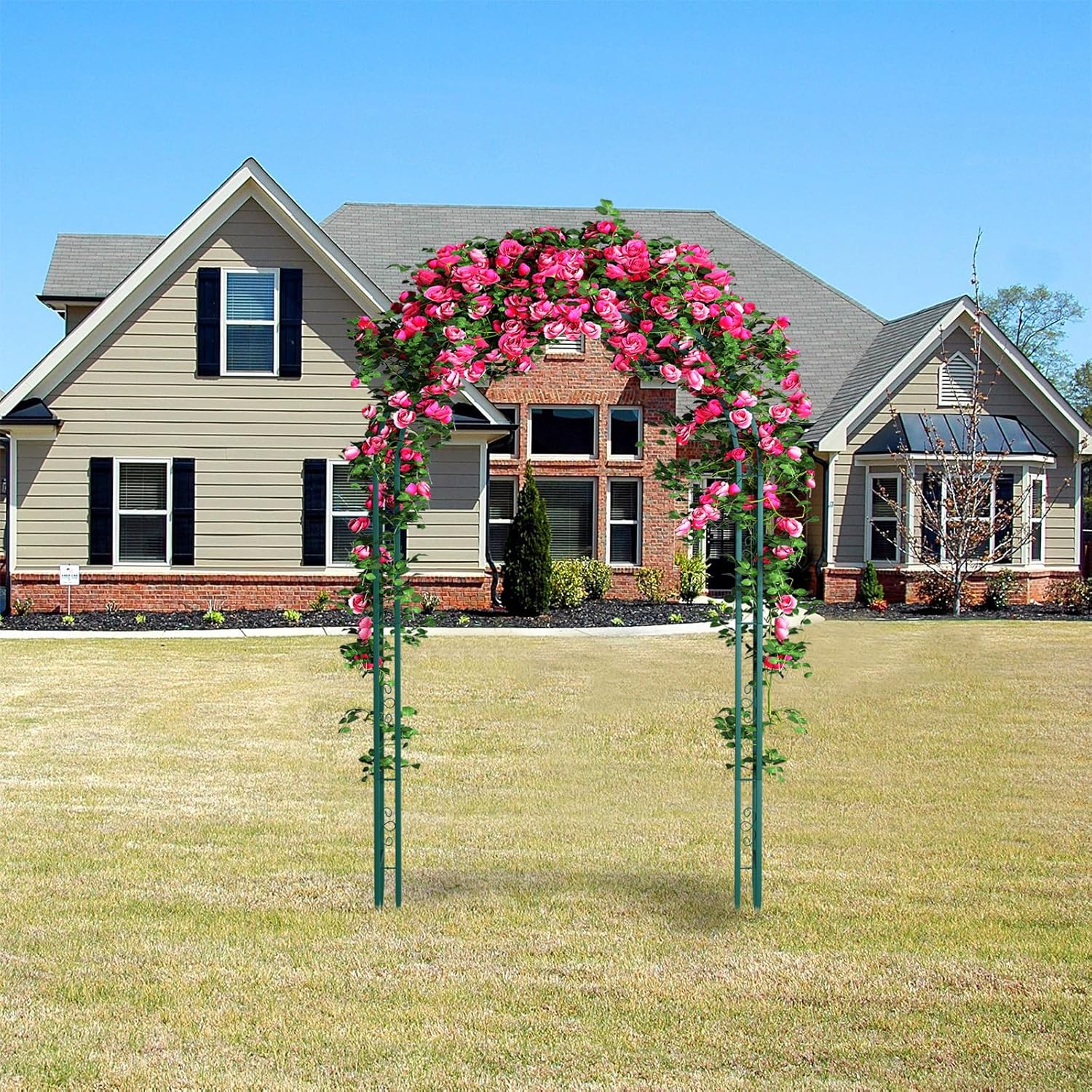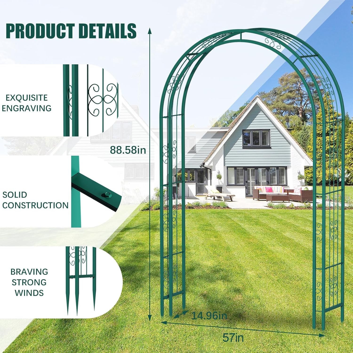 - 【Perfect for Outdoor Use】Our metal arch is mainly designed as an eye-catching decoration on garden, yard, patio or park. You can place it in front of your doorway or the pavement, making a perfect entry out of it. Or you can use it as a decorative backdrop for your wedding to bring you wonderful memories.Arch size: 57" wide x 88.6" high,7ft.