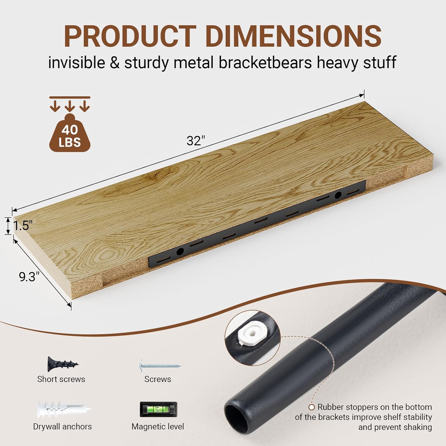 - 【Sturdy & Reliable Material】The floating shelves for wall 32 inches long use metal brackets and screws to be firmly fixed to the wall without sagging.Our oak floating shelves are made of high quality MDF material,can hold up to 40 lbs to safely place your items.