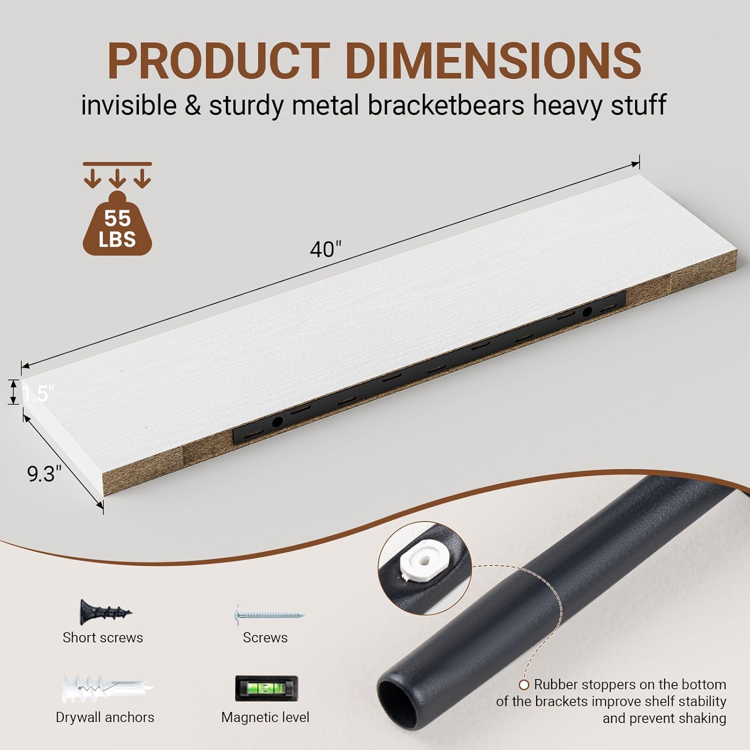 - 【Longer Design】Our pretty white wall shelves are 40"W x 9.3"D x 1.5"H.Our white floating shelves is longer than traditional designs and can hold more items.The white floating shelf optimize wall space,helping organize essentials without taking up floor space in your home.