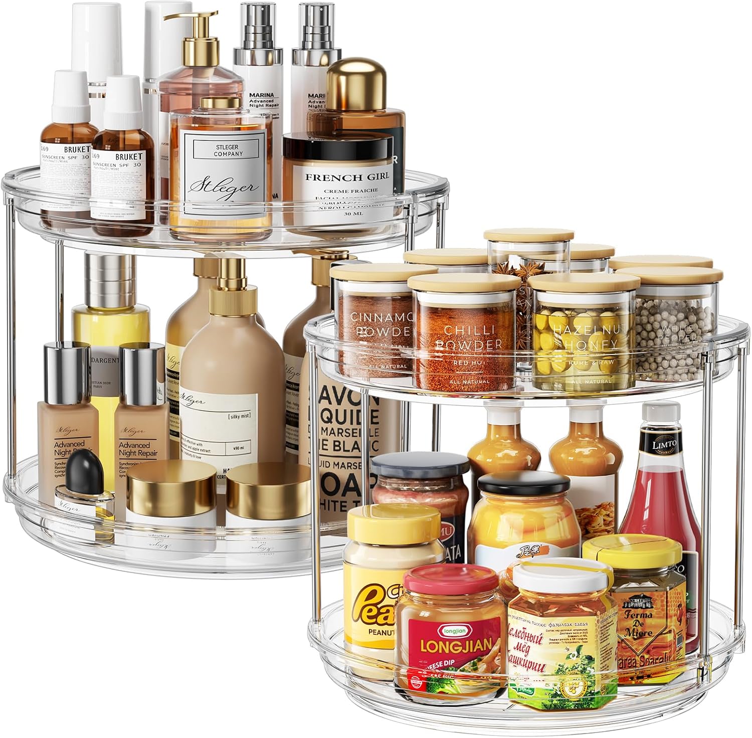 - Upgrade Stackable Functionality: Need more storage? Purchase two sets of 2 tier lazy susan and easily stack them to create a 3-tier lazy susan spice rack and a normal turntable organizer. This flexible design fits various organizers and storage needs from your kitchen to bathroom countertop