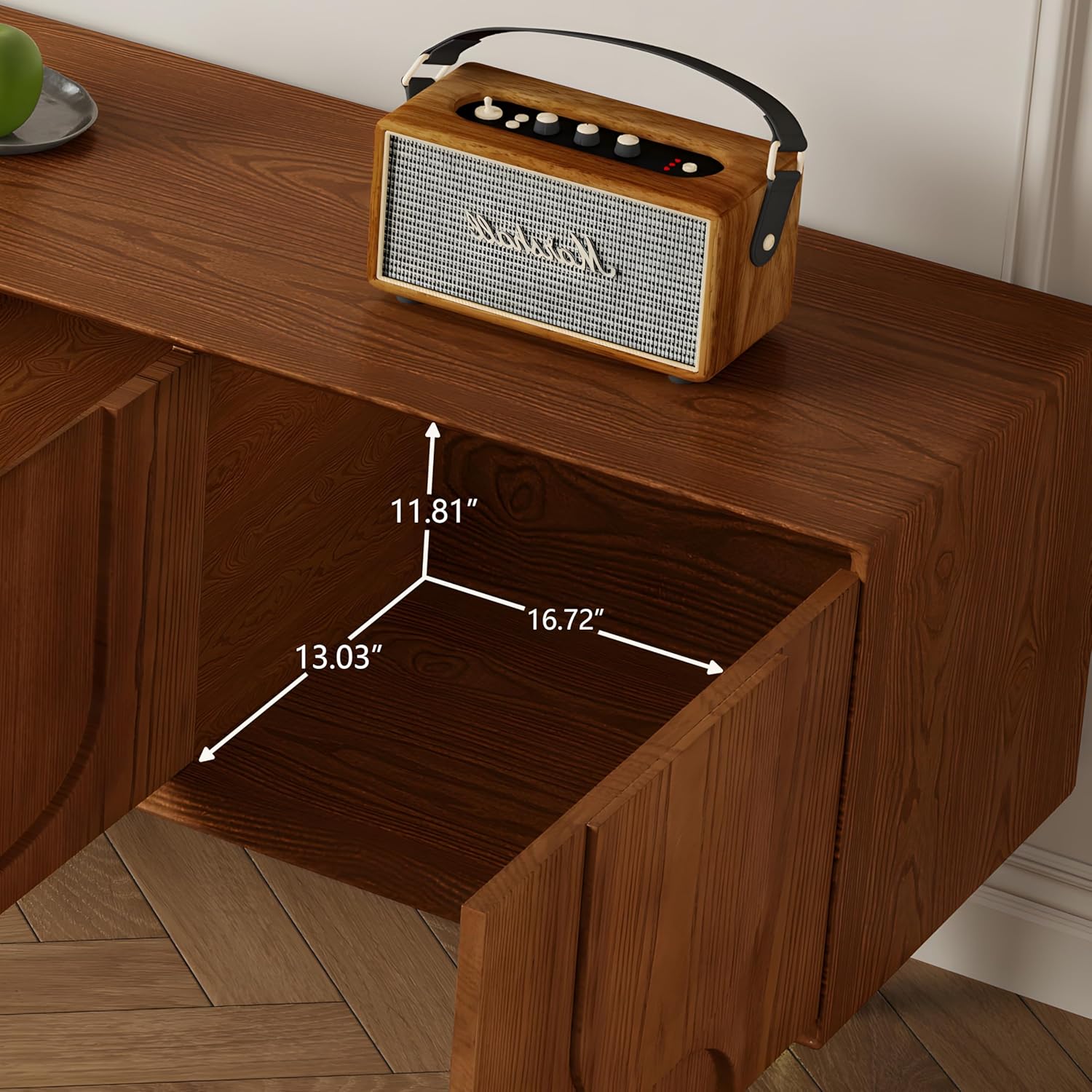 - PREMIUM MATERIAL: The TV entertainment stand is meticulously crafted from premium mdf and veneered with walnut. This material provides a solid and sturdy foundation, ensuring that the cabinet can withstand the test of time. Paired with the walnut veneer that showcases natural wood grain, it creates a warm and inviting atmosphere