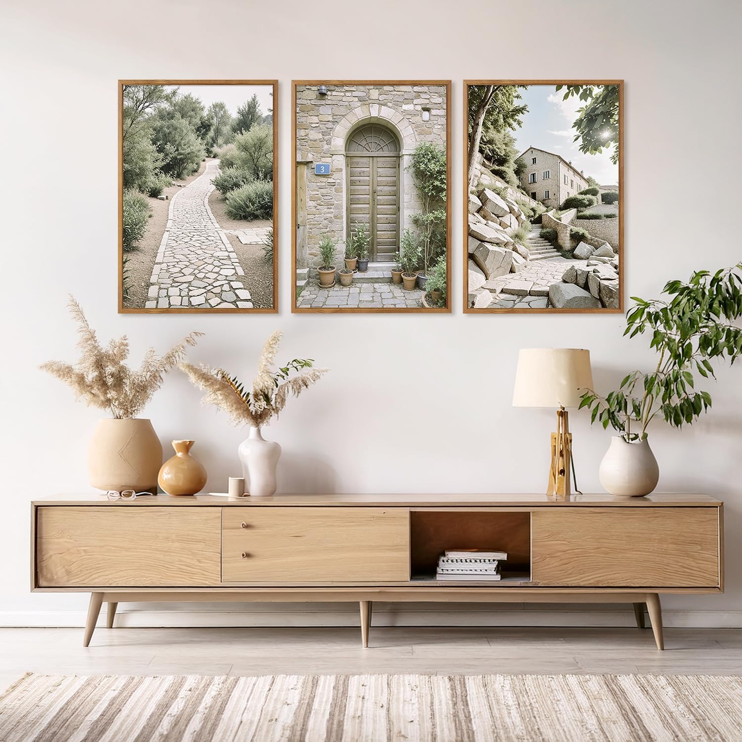 Aurlan Neutral Italy Countryside Landscape Framed Wall Art(16"x24"), 3PCS Vintage Mediterranean City Photography Gallery Canvas Artwork, Large Old Town Architecture Travel Decor Prints for Office Bedroom