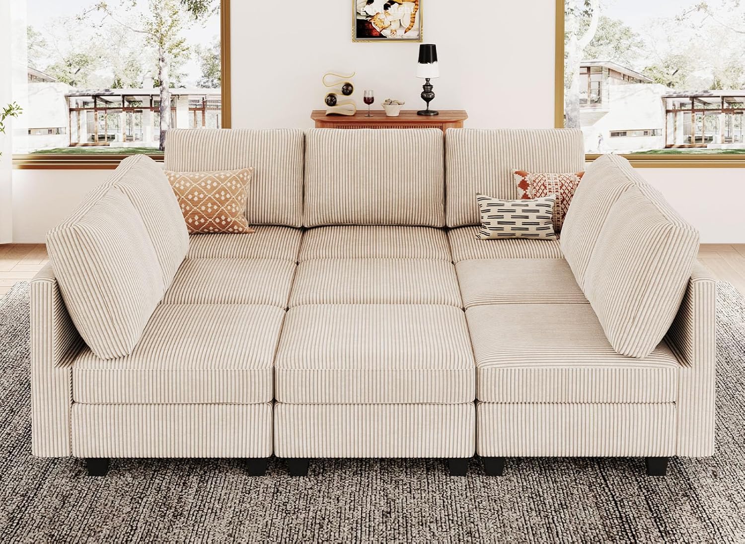 - Concealed Storage for Clutter-Free Living: The sofa features ample hidden storage beneath its ottomans and seats, keeping your room tidy and organized. A sturdy solid wood frame provides the necessary support, ensuring the sofa retains its shape and function even with regular use.
