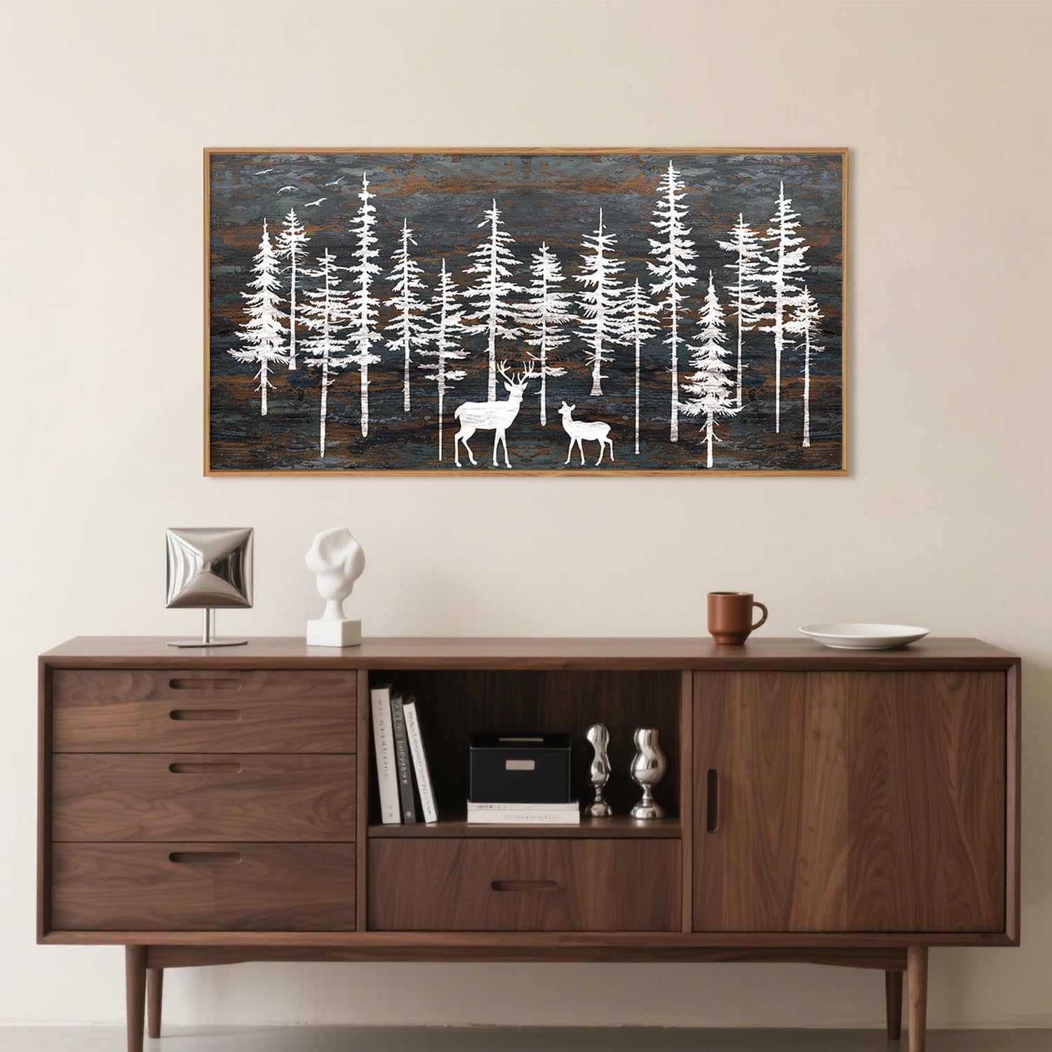 Modern White Forest Framed Canvas Wall Art Set, Minimalist Woodland Art Painting, Retro Tree Landscape Wall Decor, Wildland Deer Artwork for Living Room, Dining Room, Office - 20"x40"
