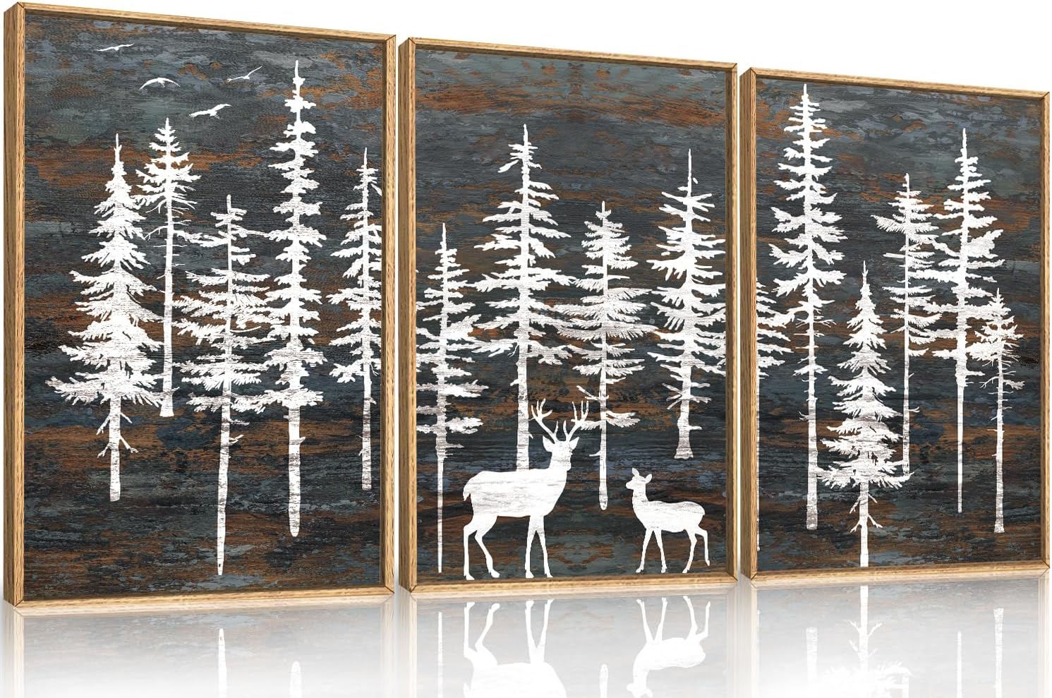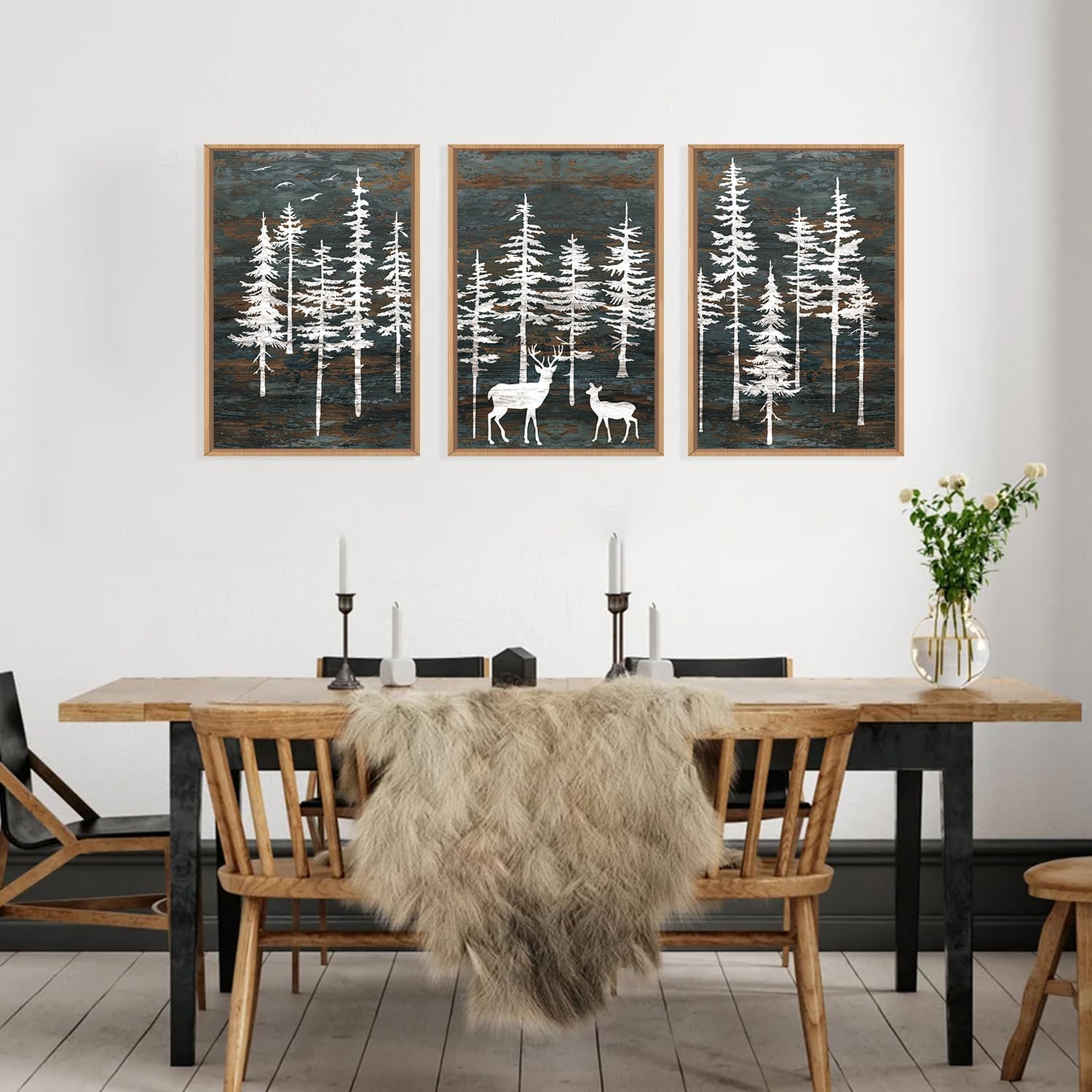 Celestdeco Modern White Forest Framed Canvas Wall Art Set, Minimalist Woodland Art Painting, Retro Tree Landscape Wall Decor, Wildland Deer Artwork for Living Room, Dining Room, Office - 24"x36"x3