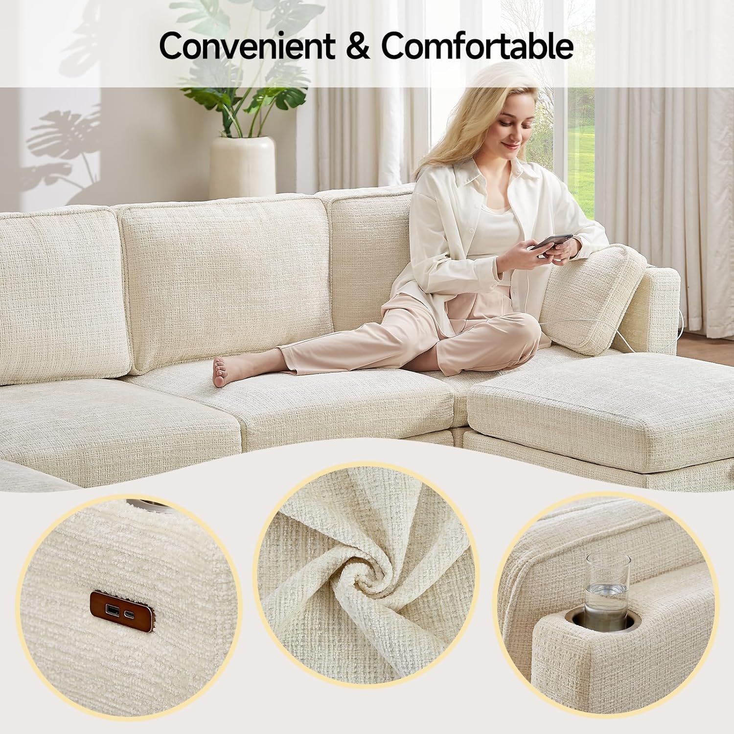 110" Modular Sectional Sofa, Convertible Sleeper Sofa Couch Bed with Adjustable Backrest, U-Shaped Chenille Cloud Couch with Ottoman Storage, Deep Seat Couches for Living Room,Beige