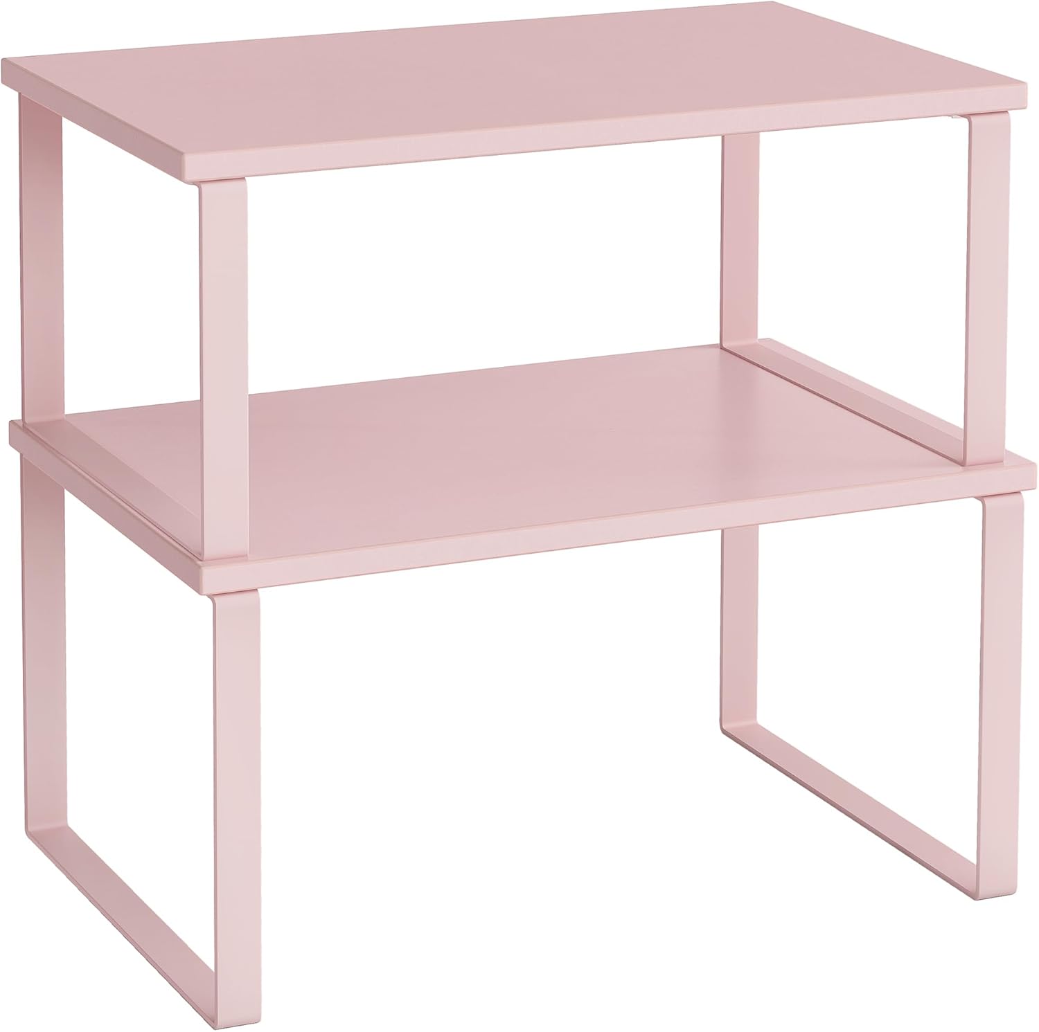- [Adjustable] With their unique design, with one slightly smaller than the other, these shelf organizers can be stacked on top of one another, nested, used separately, or even in an L-shape. Adjust them how you want to perfectly fit your kitchen space