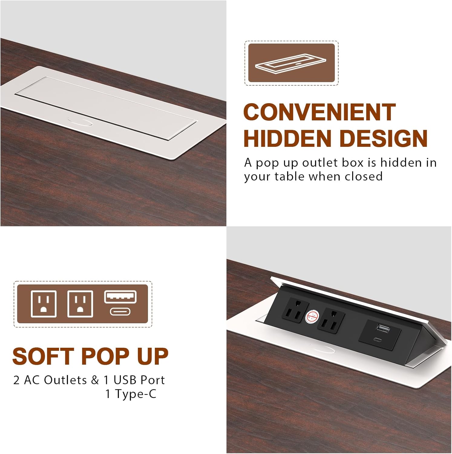 - Hidden Quick Charge: The flip-top charging station includes 2 AC outlets,1Type-C USB port, and 1 standard USB port, providing convenient charging options for your electronics. For added safety, the station is equipped with a lift function.This design ensures that children and pets cannot accidentally touch the charging ports.