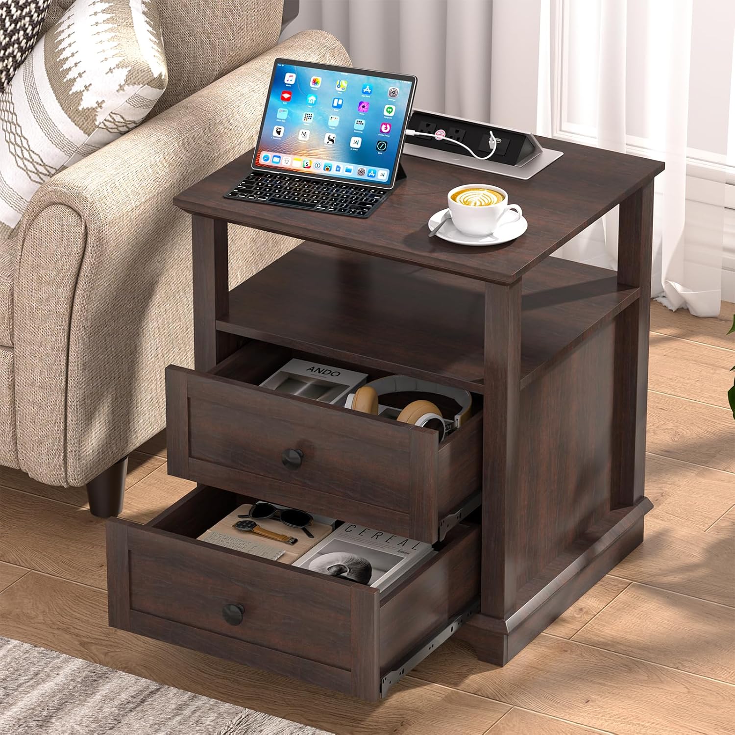 HIFYOBRO Large End Table Set of 2, 2 Drawers and Charging Station, Type-C & USB Port & Power outlets, Wooden End Table, Side Table with Storage for Living Room and Bedroom (Espresso)