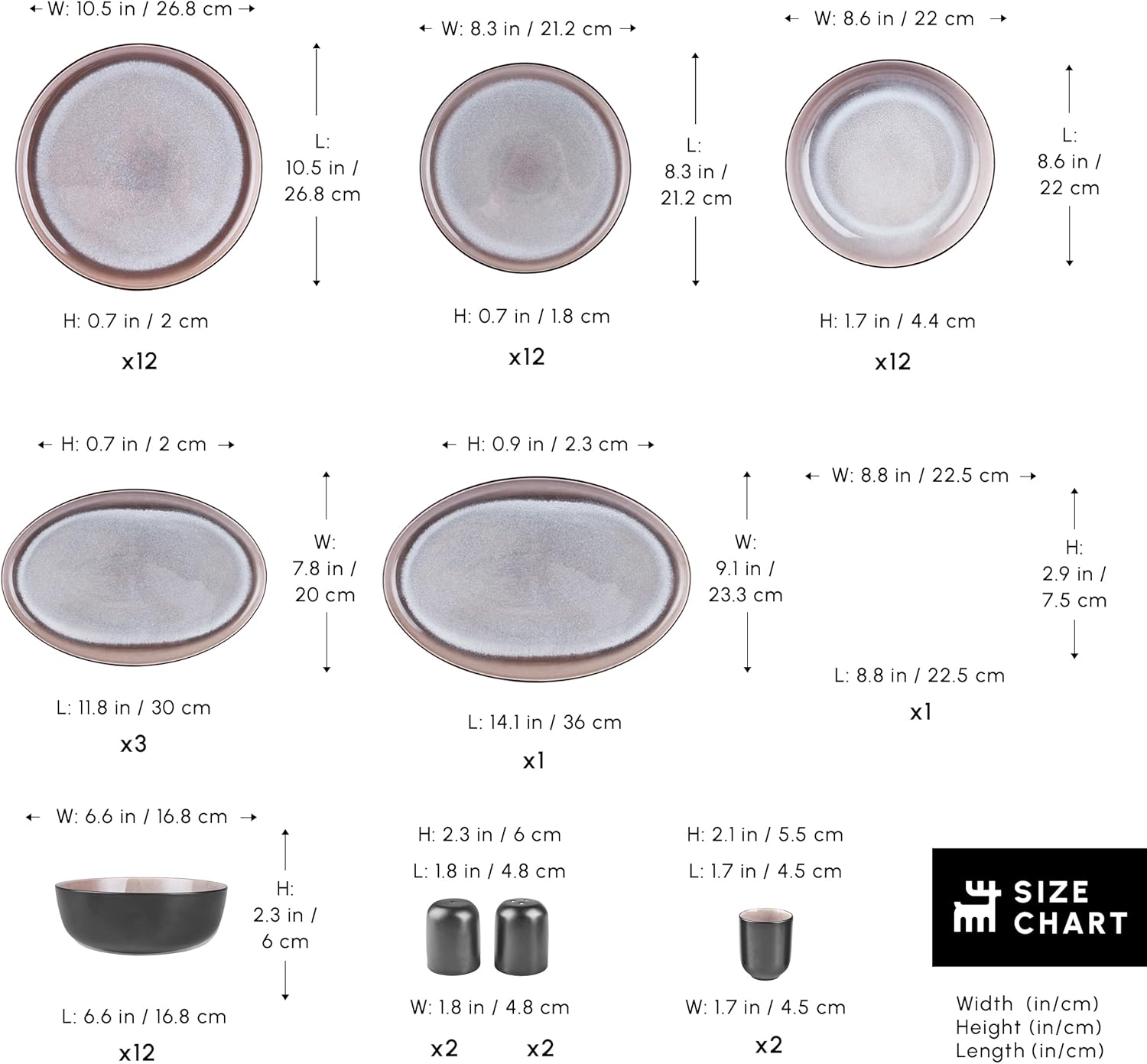 - Complete Set for 12: This plate set contains 12 dinner plates (26.8cm, 10.5”), 12 dessert plates (21.2cm, 8.3”), 1 salad bowl (22.5cm / 8.8"), 12 pasta bowls (22cm / 8.6"), 12 cereal/soup bowls (16.8cm, 6.6”), 3 small serving platters (30cm / 11.8") and 1 large serving platter (36cm / 14.1"), 2 salt and pepper shaker and 2 toothpick holders. Designed to be used by 12 diners and ideal for family gatherings and special occasions.