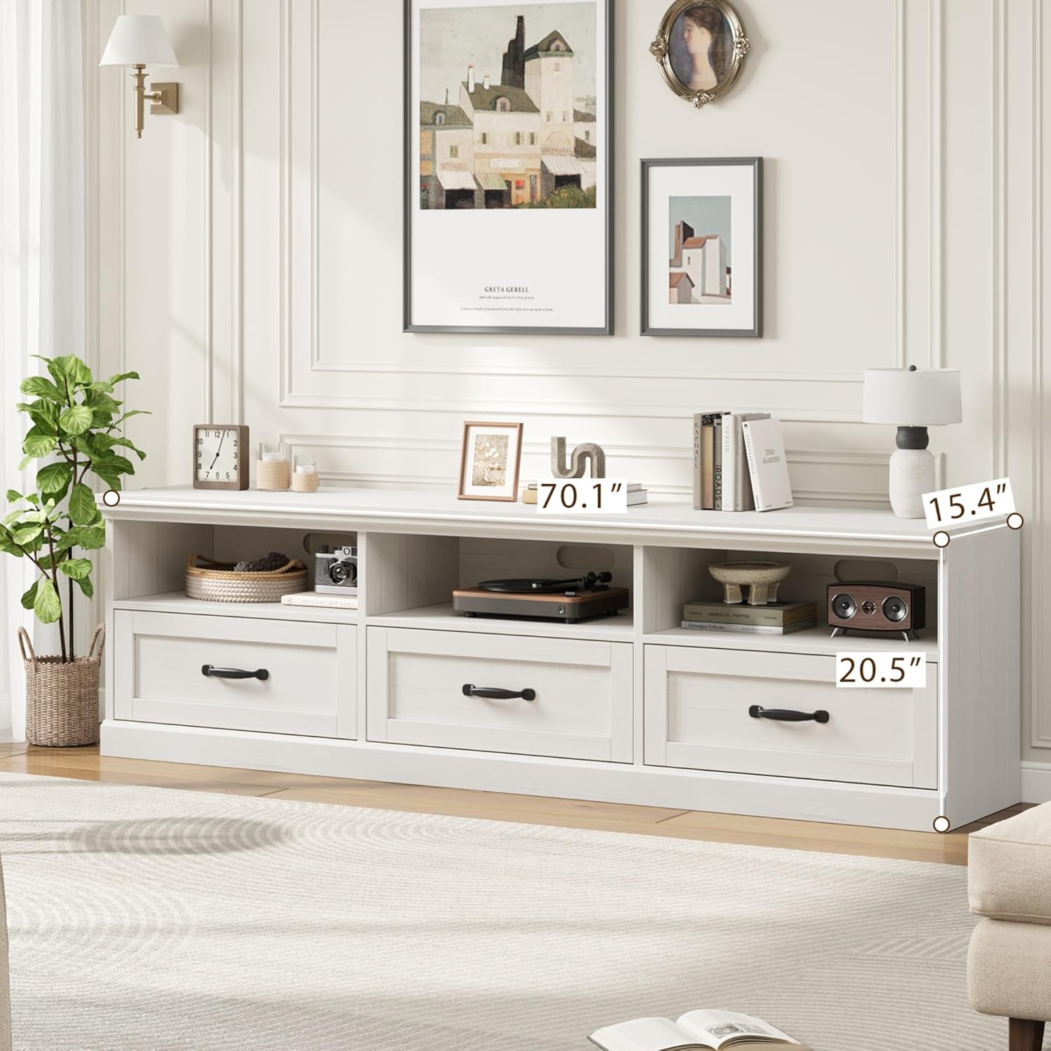 - DIMENSIONS & STORAGE: This tv cabinet measures 70” L x 15.4” W x 20.5” H and accommodates flat or curved TVs up to 75 inches. The tv console table provides ample storage space with a combination of open shelves for decor and media devices, plus drawers to neatly stow away remotes, cables, and other essentials