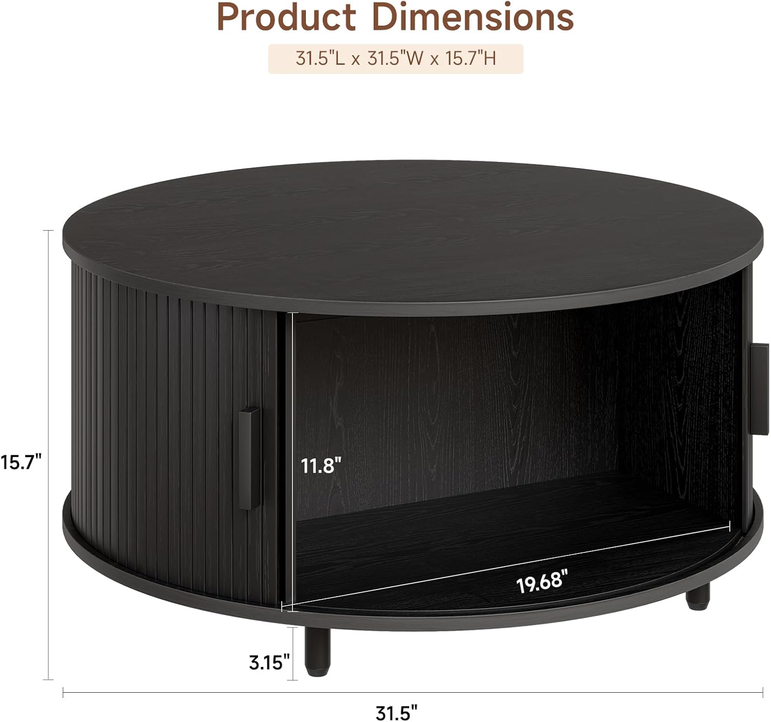 Round Coffee Table with Storage, 31.5" Modern Coffee Table with 360° Curved Sliding Door, Fluted Wood Accent Coffee Table with Adjustable Footpads, Round Center Table for Living Room, Black