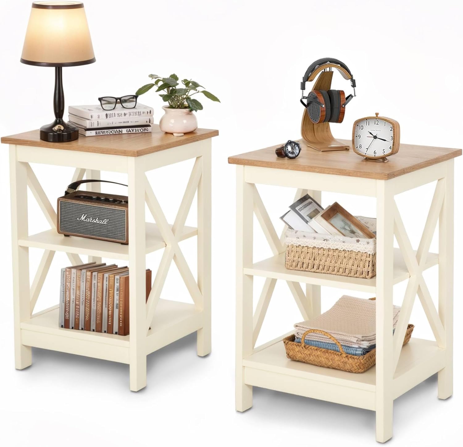 ALPHA HOME Side Table, Farmhouse End Table Set of 2, Bedside Table 3-Tier Storage Shelf for Small Spaces, Sofa Couch Table, Coffee Table, Nightstands Set for Living Room, Bed Room, Ivory