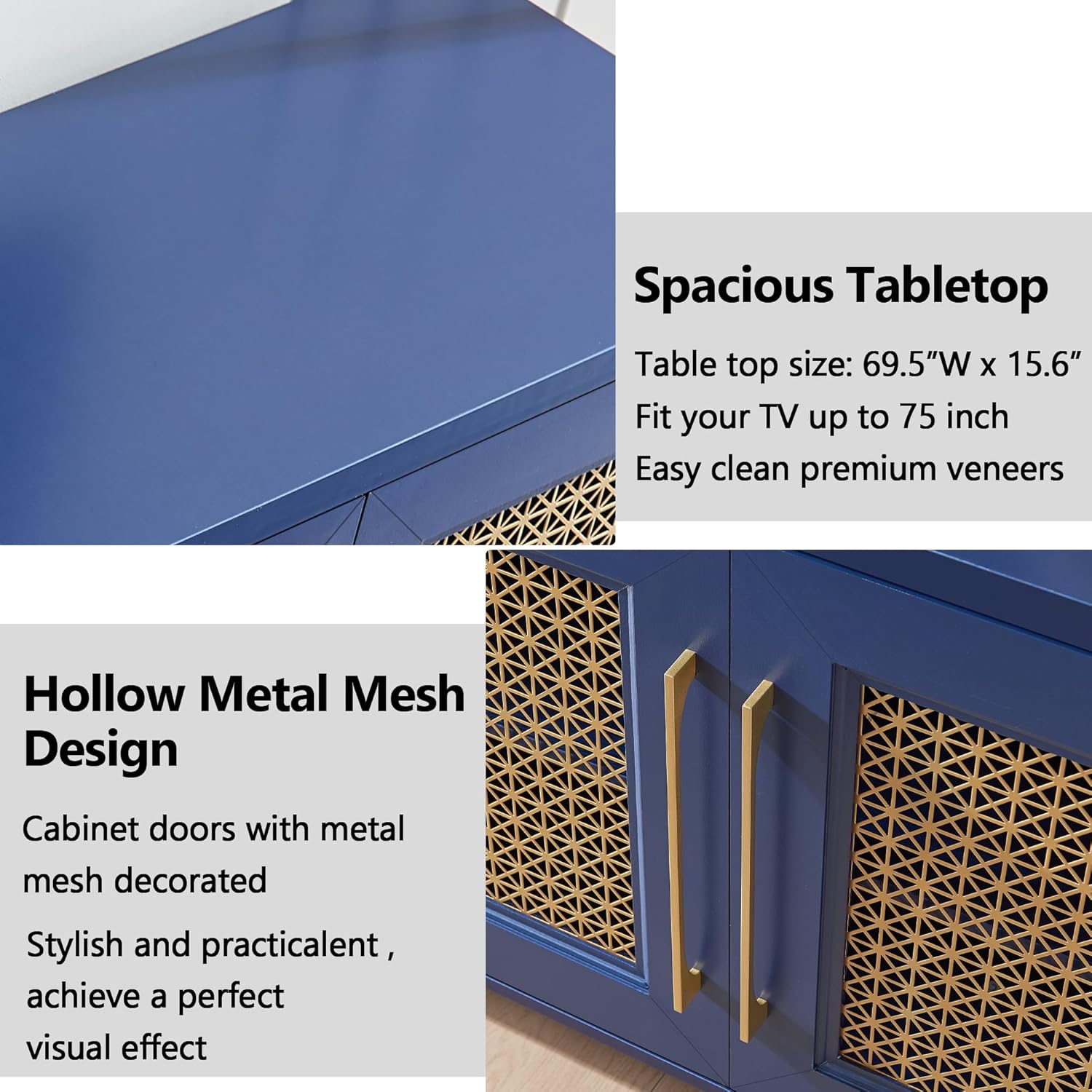 JYED Mid Century Modern TV Stand for TVs up to 75", 69.5" W Blue Entertainment Center with 4 Gold Metal Mesh Doors - Wood Grain MDF TV Console, Media Storage