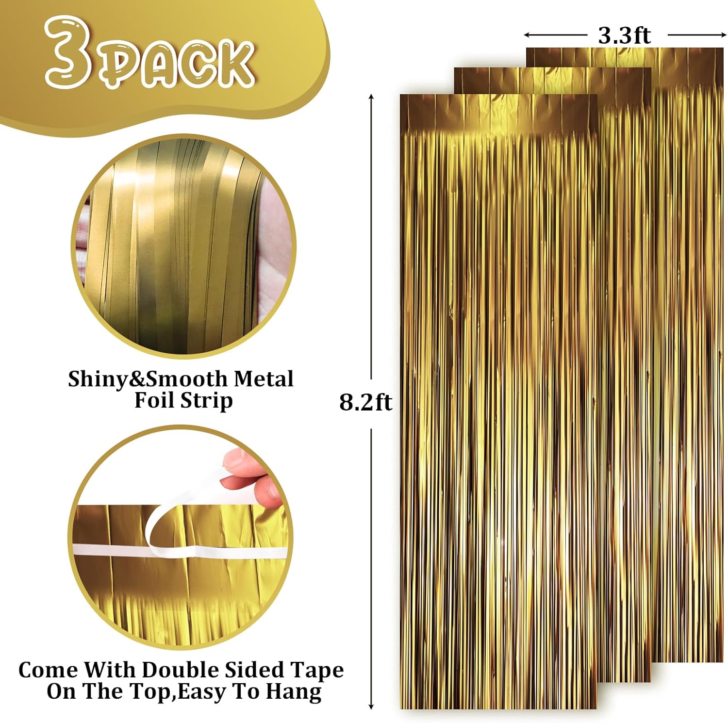 3 Pack 3.3 x 8.2 ft Matte Gold Foil Fringe Backdrop Curtains, Tinsel Streamers Party Decorations, Fringe Backdrop, Door Shimmer for Graduation, New Years Eve, Birthday Party