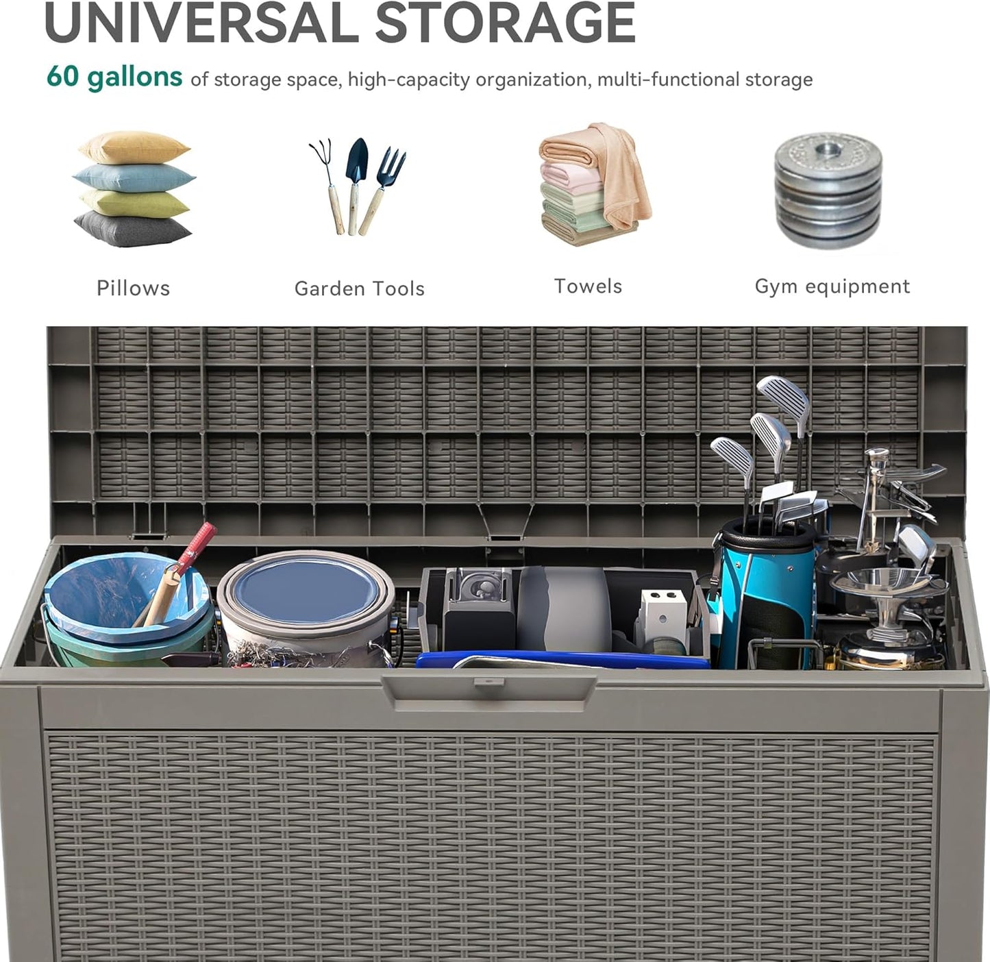 - Multi-Purpose Use: Ideal for both indoor and outdoor storage needs, this plastic deck box accommodates patio cushions, gardening tools, pool gear, and other items to meet your needs
