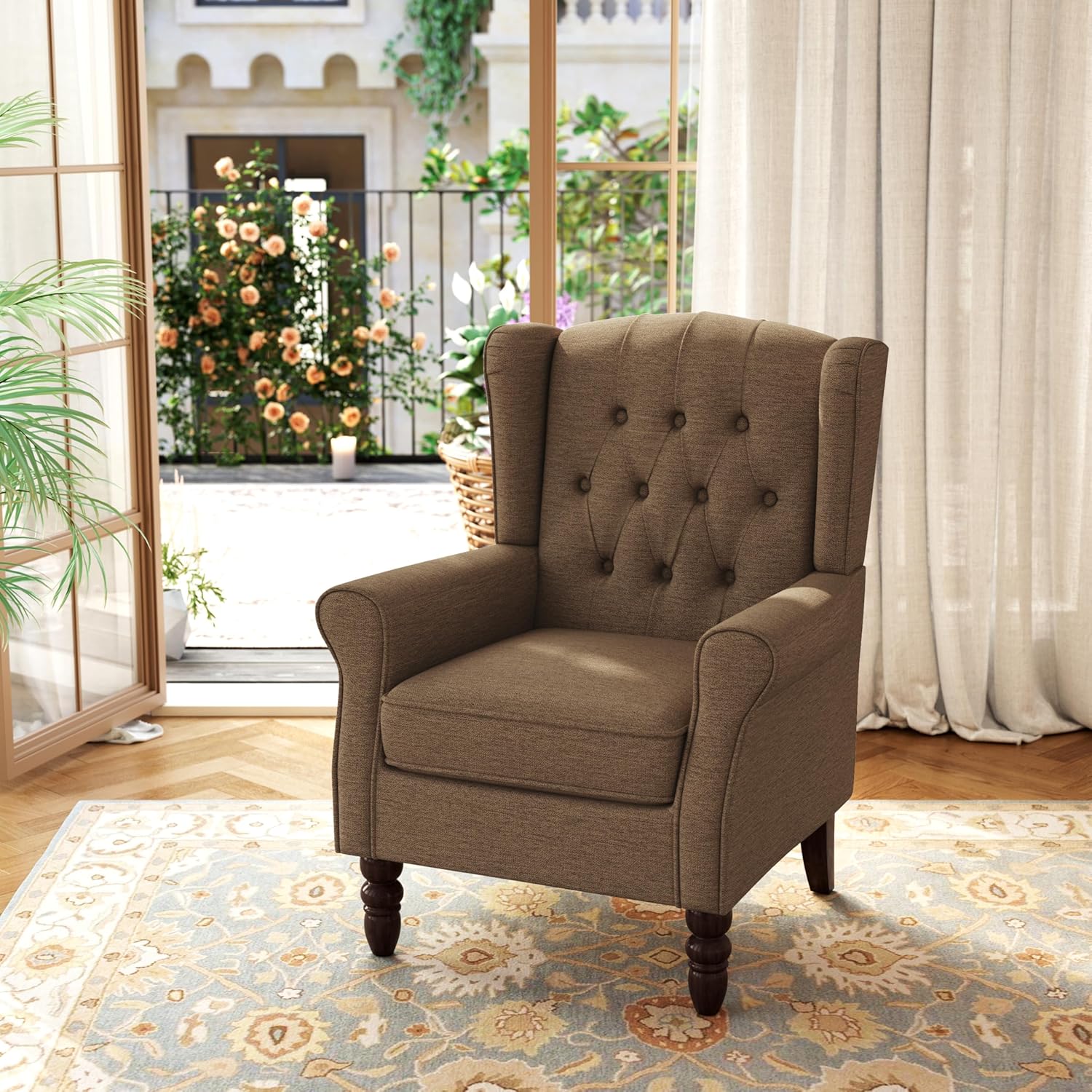 Accent Chair, Upholstered Armchair with Button Tufted High Back & Solid Wood Legs, Comfy Wingback Reading Single Sofa Chair for Small Spaces, Living Room, Bedroom (Brown, Set of 2)