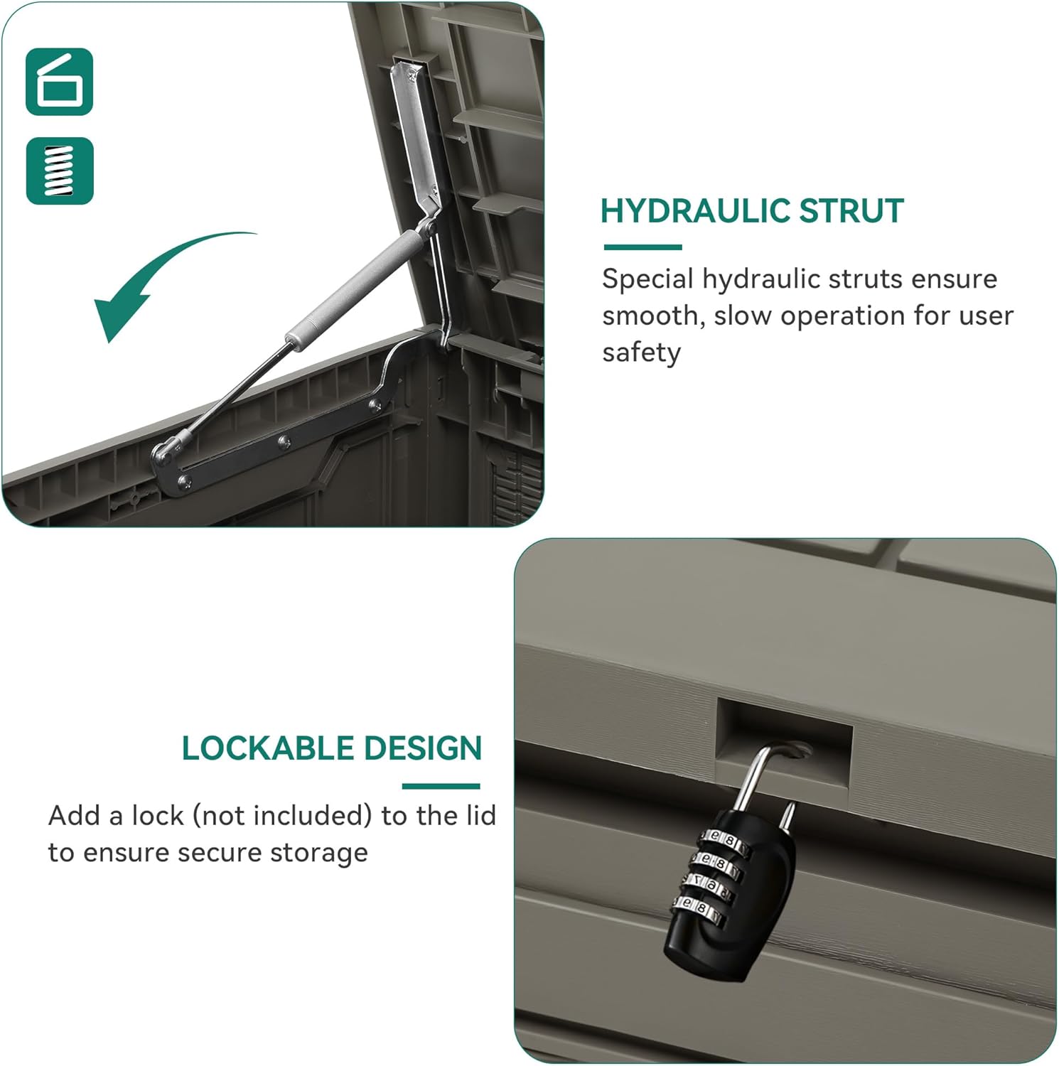 - Multi-Purpose Use: Ideal for both indoor and outdoor storage needs, this plastic deck box accommodates patio cushions, gardening tools, pool gear, and other items to meet your needs; The deck box with lock feature offers enhanced security(Locks not included)