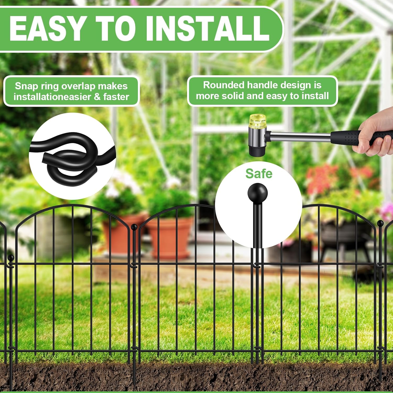 - 【Customizable Size】Our garden fence animal barrier comes with 10 panels, each panel 12.5" wide by 17" high, for a total length of 10 ft. The metals garden fence also comes with 11 sturdy 17-inch metal stakes and a mounting tool, the metal stakes are inserted into the soil to a maximum depth of 7 inches, akes the dog fence more stable and less prone to shaking. Dog fence outdoor for yard are flexible and can be easily expanded and customized to meet your specific landscape needs.