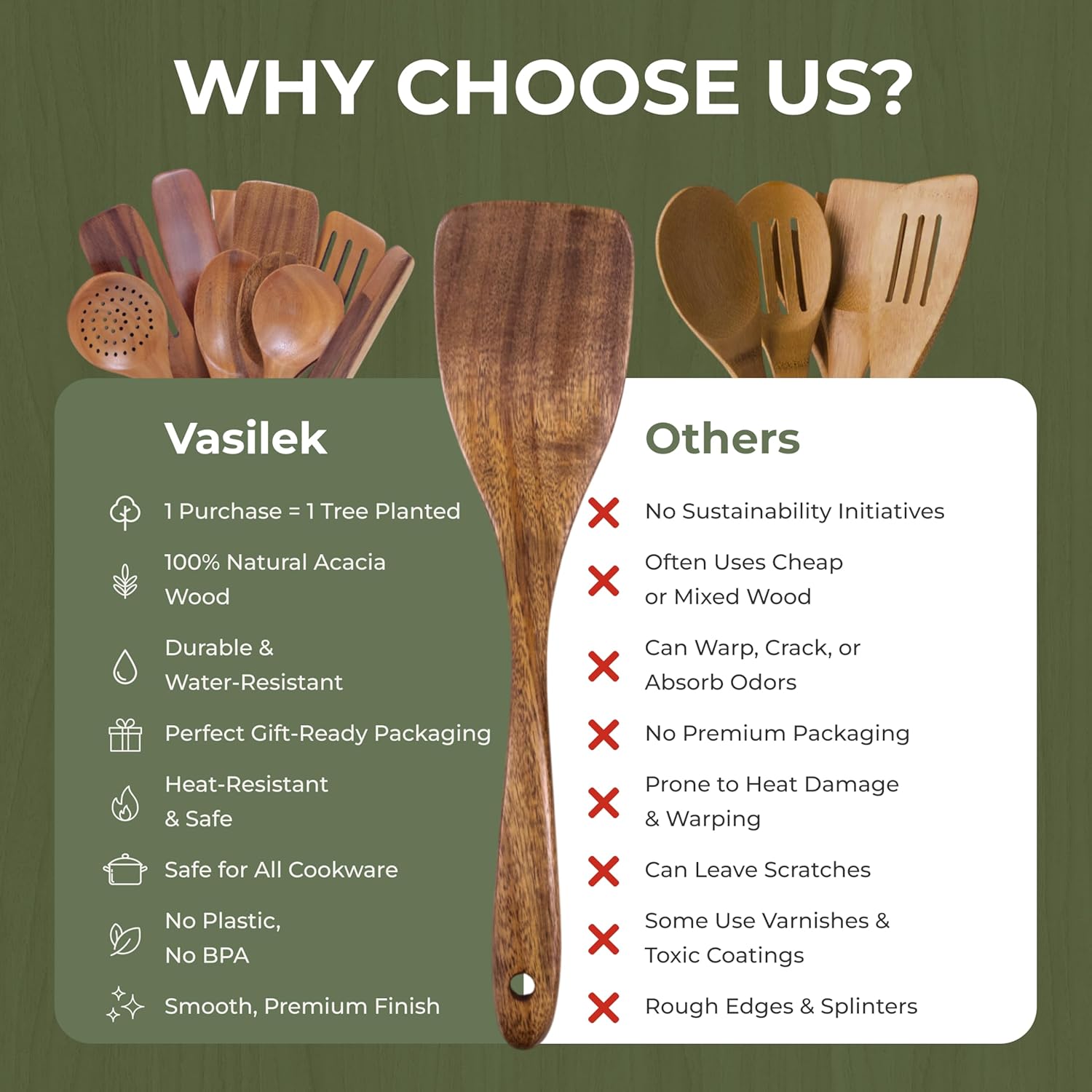 Vasilek Wooden Cooking Utensils Set – 12-Piece Acacia Wood Kitchen Utensil Set with Square Holder & Spoon Rest, Non Toxic Wooden Tools for Nonstick Cookware, Spatula, Ladle, Serving Spoon