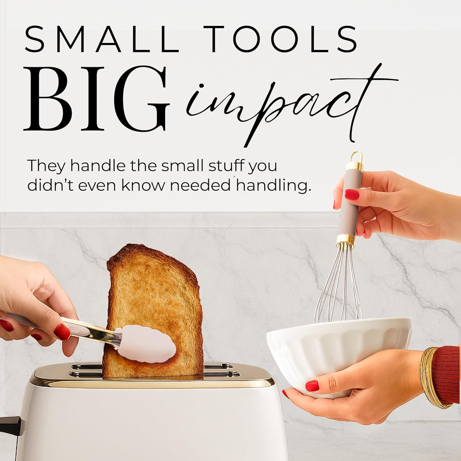 - COMPACT SIZE, MAXIMUM GOLD STYLE: Small in size but big in function, these beige and gold kitchen accessories fit beautifully in smaller spaces while still delivering all the glam of a full-size gold utensils set.