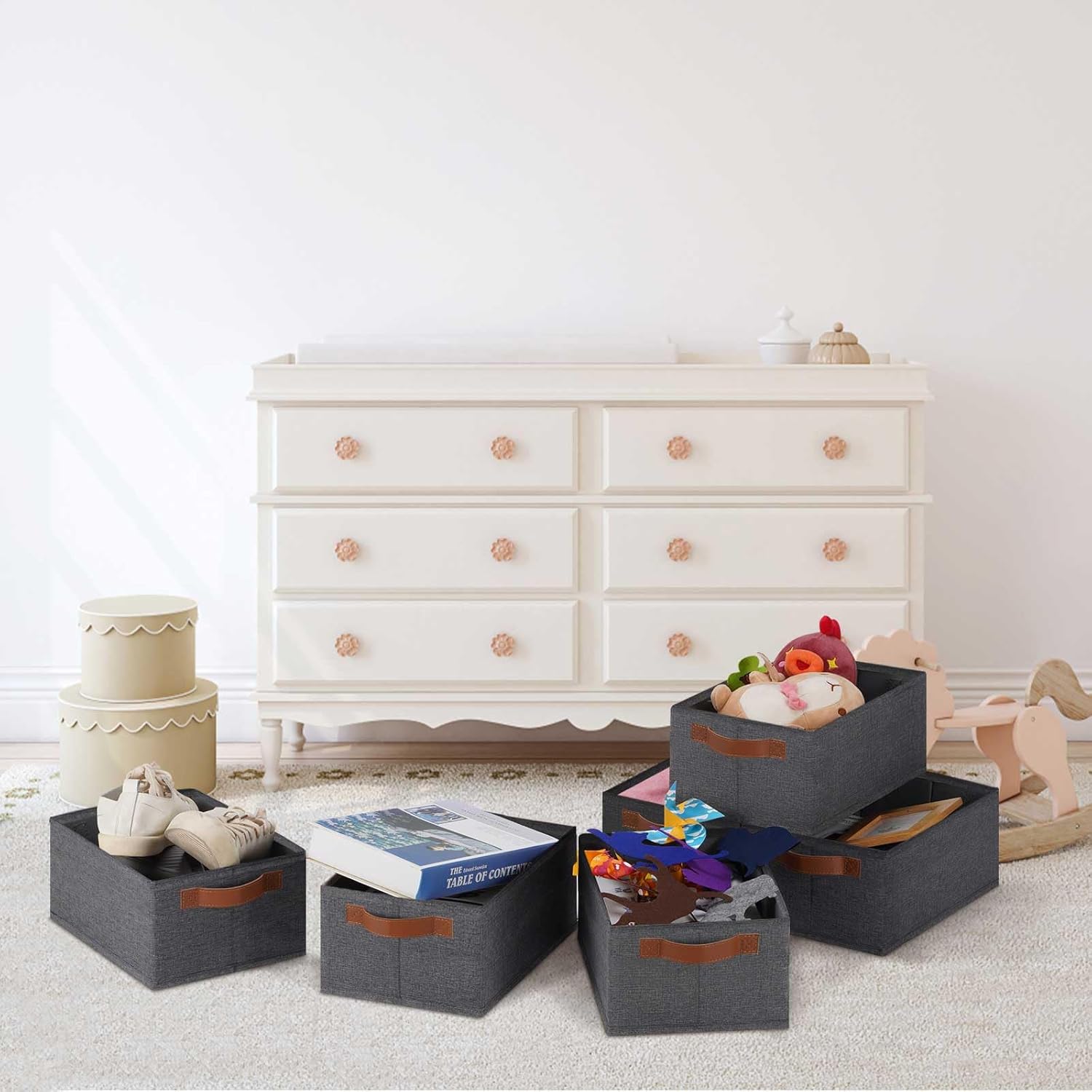 - 👍【QUALITY MATERIAL】Storage baskets for shelves are made of high-quality cationic fabric and polyester cotton fabric, and the inner layer is made of non-woven fabric, which is odorless, long-lasting and strong. Classic faux leather handles that adds a comfortable touch and provides a strong and comfort grip to pull and move. Fabric storage bin is easy to clean, just wipe with a damp sponge or cloth.