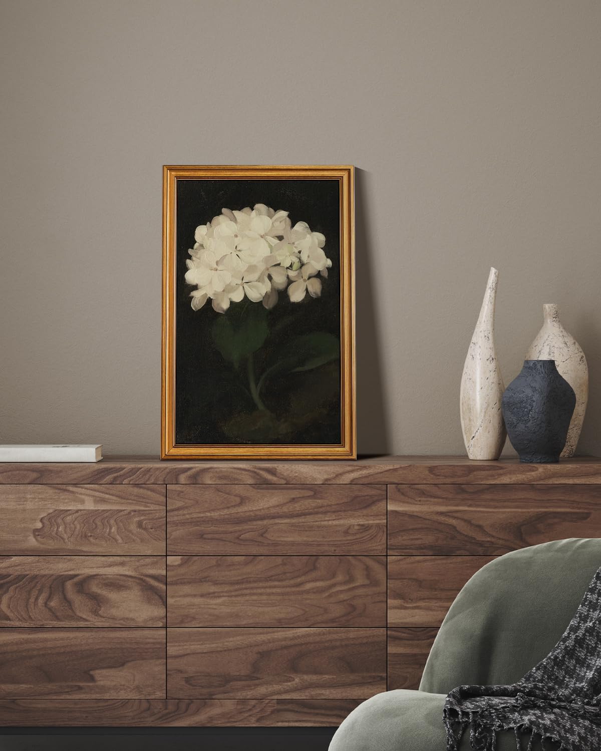 HUARCEY Gold Framed Vintage Wall Art for Living Room, Flowers Painting Canvas Prints Shelf Decor for Kitchen, Aesthetic Bedroom Wall Art, Christmas Gifts for Friends Family (White Hydrangea 16"x24")