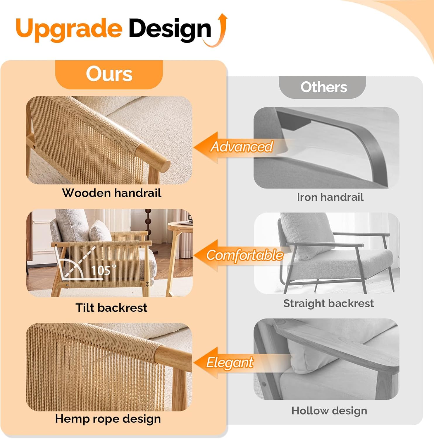 - Braid Design : The Boho-inspired Braid Accent Chair showcases elegant paper cord weaving across its angled armrests. Its thoughtful design combines comfort and style with a medium-height backrest and plush cushioning. This piece seamlessly blends casual and sophisticated interior comfort, perfect for home decoration.The two chairs will be shipped in separate packages. Please note that they may not arrive at the same time.