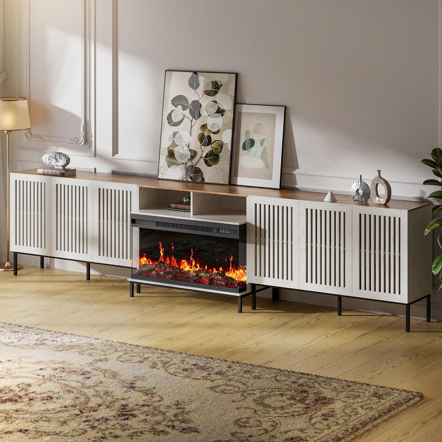 - Unique Design: This Farmhouse TV stand lies in its unique design that seamlessly merges rural charm with modern elegance.The grating door design adds a touch of rustic style, while also allowing for easy access to the storage compartments.
