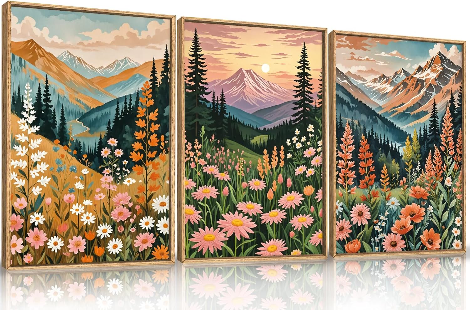 HPINUB Mountain Sunset Floral Framed Canvas Wall Art Set,Colorful Wildflower Daisy Flower Wall Decor,Boho Blossom Botanical Artwork Modern Nature Landscape Art Print for Living Room,Bedroom-16 x24 x3