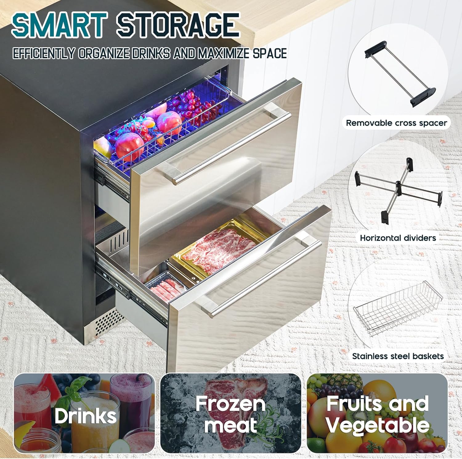 - Adjustable Shelves & Baskets: Designed with adjustable cross shelves and stainless steel baskets, this beverage refrigerator efficiently utilizes space and helps you keep drinks, fruits, or vegetables neatly organized.