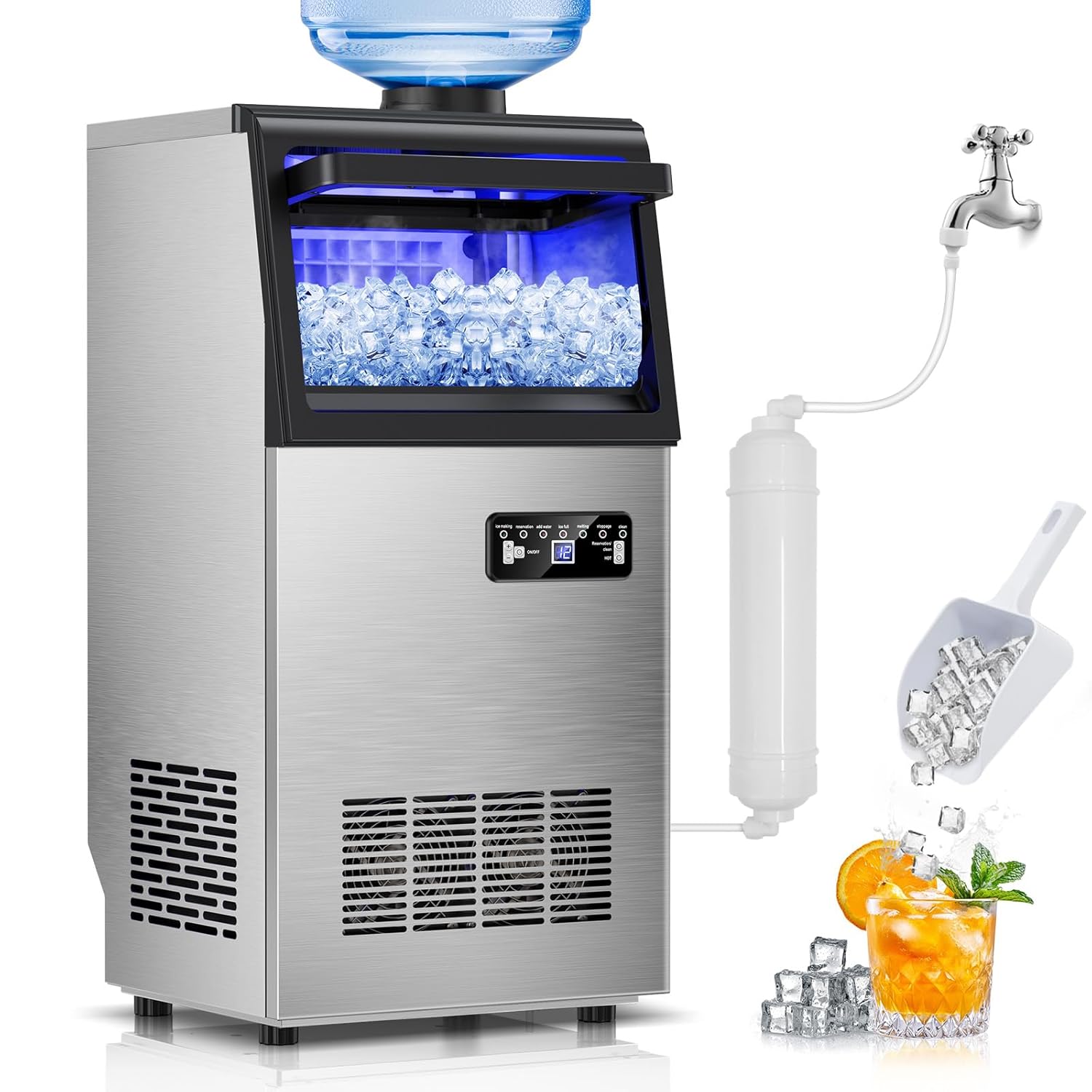 - Built with heavy-duty stainless steel and a food-grade PP liner, this icemaker machine is clean, sanitary, and durable. The ice maker machine stainless steel construction gives it a sleek and modern look that complements your kitchen, office, home, or bar.