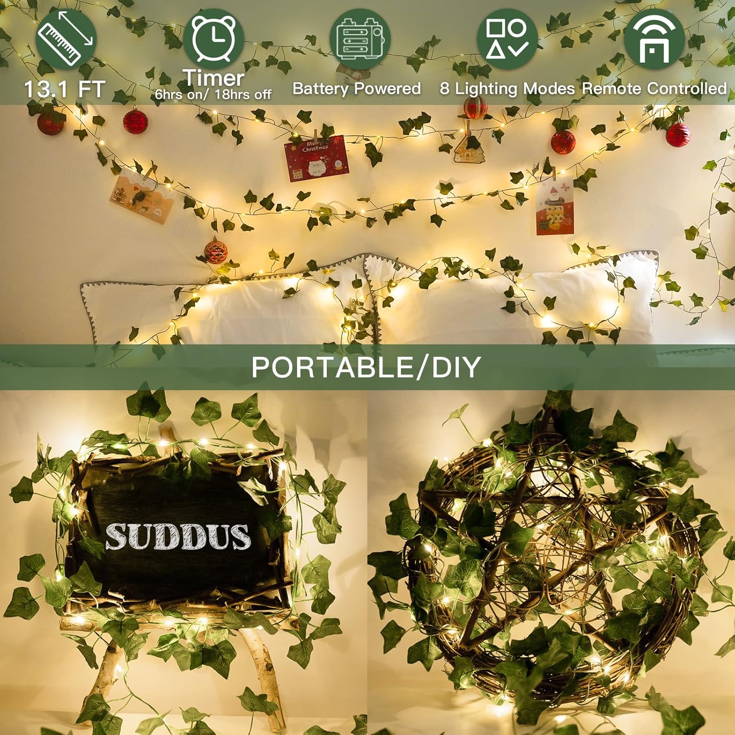suddus Vine with Fairy Lights Battery Operated, 13.1ft 40 LED Ivy String Light with Remote, Leaf Lights for Bedroom, Room, Wall, Garden, Party, Wedding Decor (Warm White)