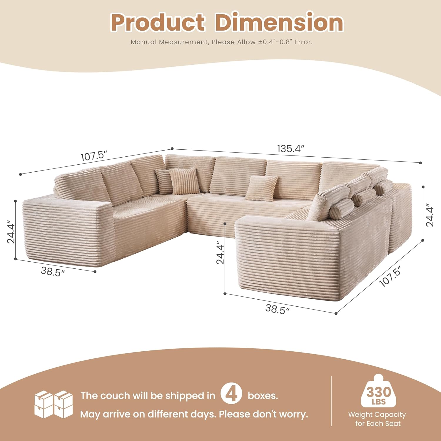 HOOOWOOO Cloud Sectional Couches for Living Room,Modular Sectional Sofa No Assembly,136X110 Inch Plush Corduroy Large U Shaped Floor Couch Set with Deep Seat(Beige)