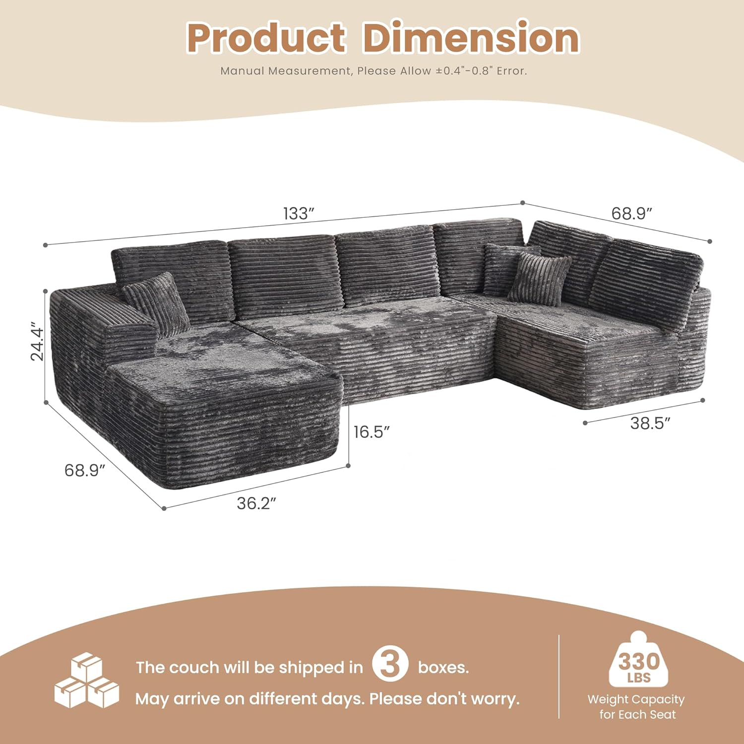 HOOOWOOO Cloud Sectional Couches for Living Room,Modular Sectional Sofa No Assembly,133X70 Inch Plush Corduroy Large U Shaped Floor Couch Set with Deep Seat Chaise Lounge(Gray)