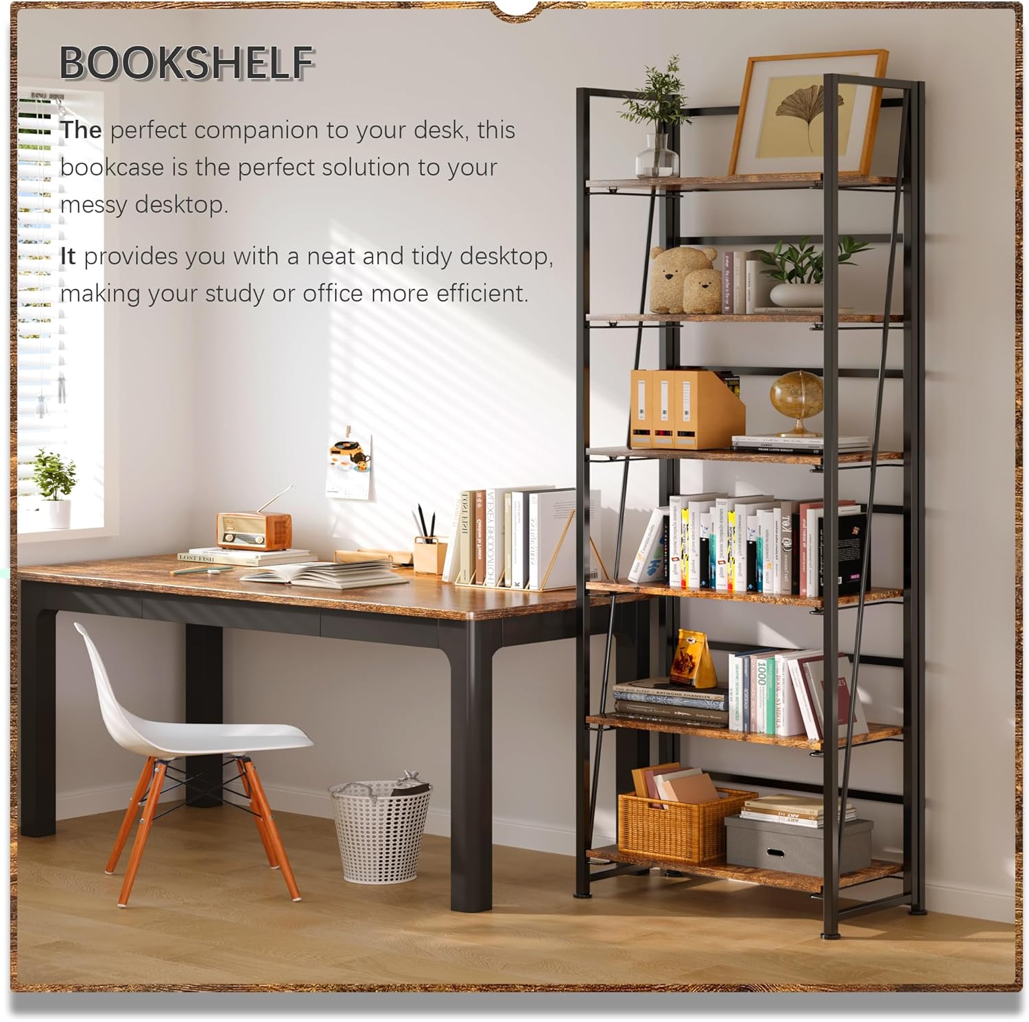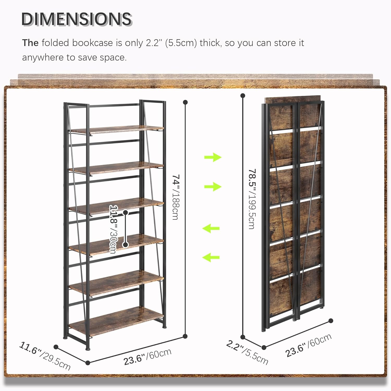 4NM No Assembly Foldable Bookshelf, 6-Shelf Collapsible Bookcase Storage for Small Spaces, 74" H, Rustic Brown and Black