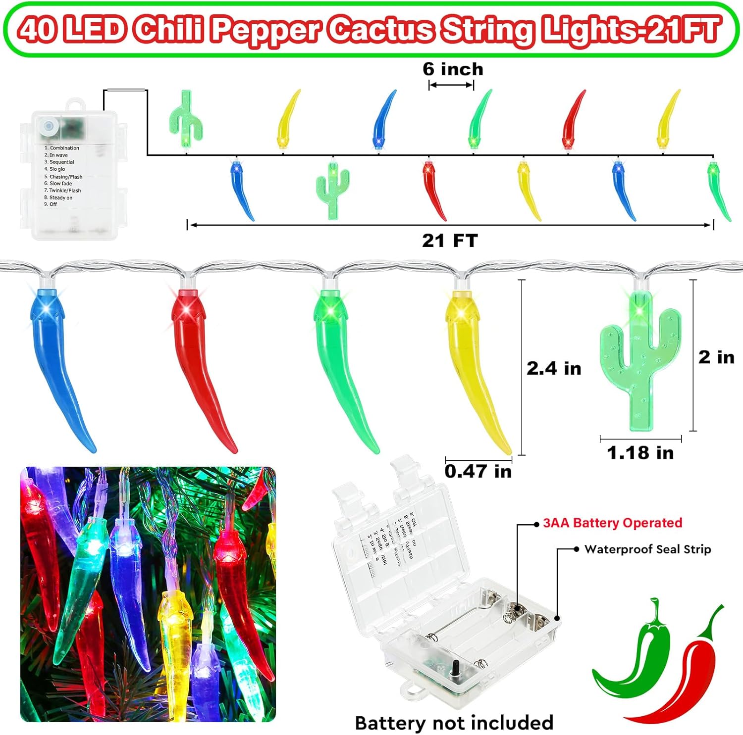 - ๐ถ๏ธBright Chili Pepper Cactus String Lights๏ผ40 LED Summer Beach Hawaiian String Lights with 4 vibrant chili pepper colors (red, blue, green, yellow) and playful cactus designs are perfect for bringing a touch of summer to your bedroom, pool party, beach party, or holiday decor. Hang these charming lights anywhere to create a cheerful and lively tropical atmosphere for your party or family gathering.