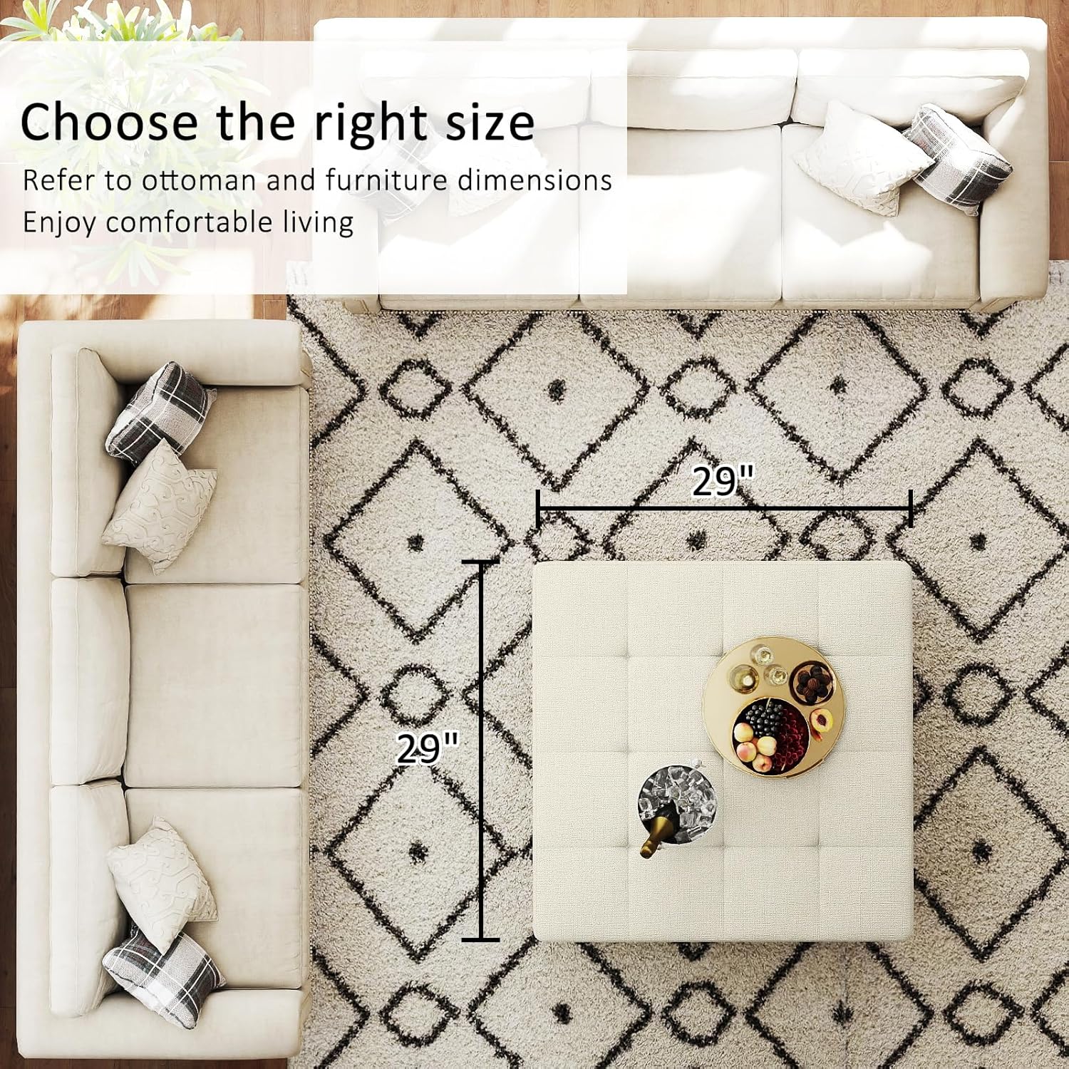 Large Square Ottoman Coffee Table, Linen Solid Upholstered Footrest Ottoman with Solid Wood Shelf Storage Tufted Coffee Table for Bedroom Living Room, Ivory