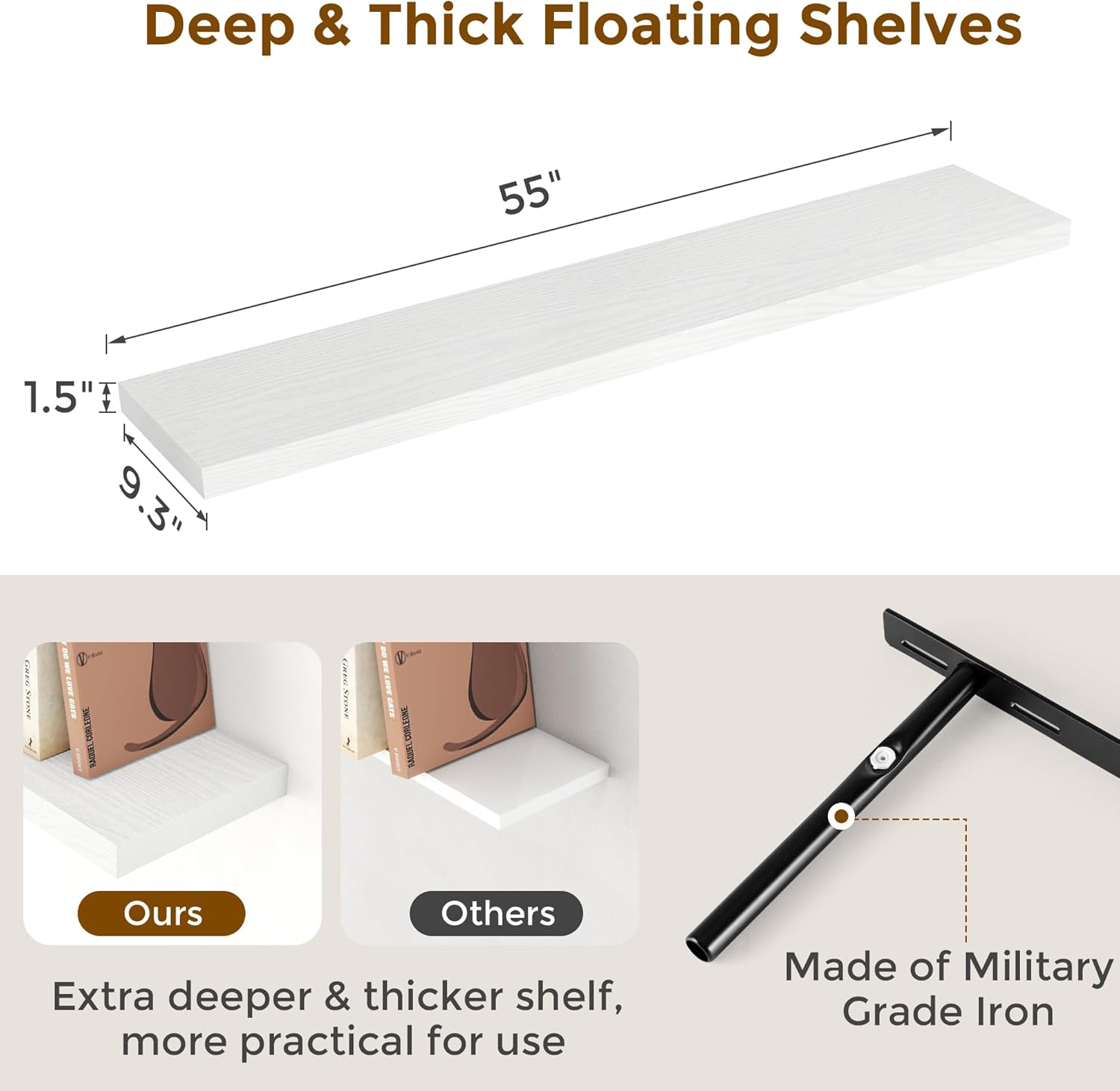 Fun Memories Floating Shelves 55 Inch Set of 2, White 55 x 9 Wall Shelves for Home Decor Storage, Rustic Wood Floating Shelf for Wall, 9 Inch Deep Shelving for Bathroom, Living Room, Kitchen